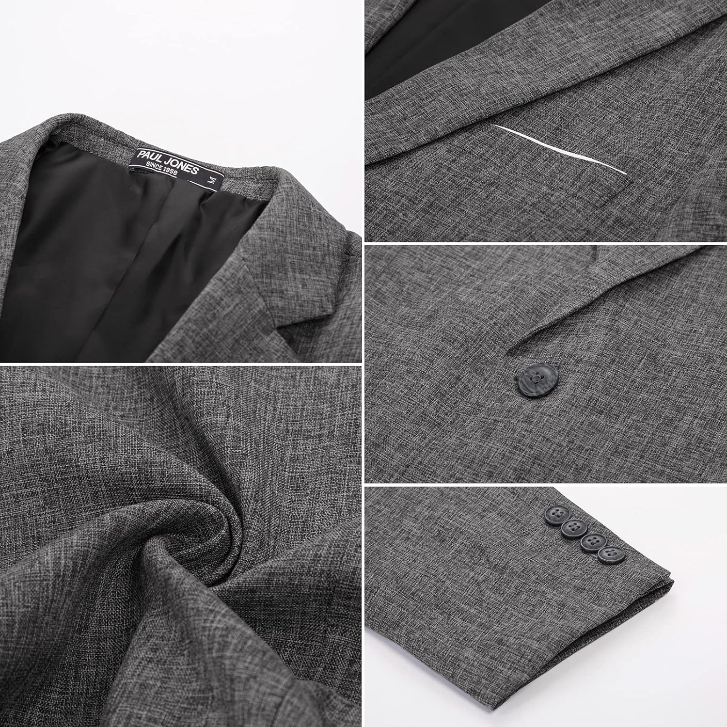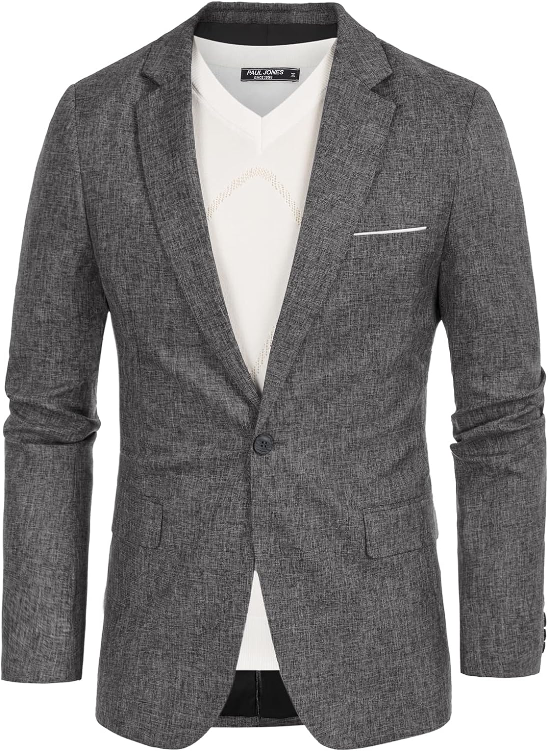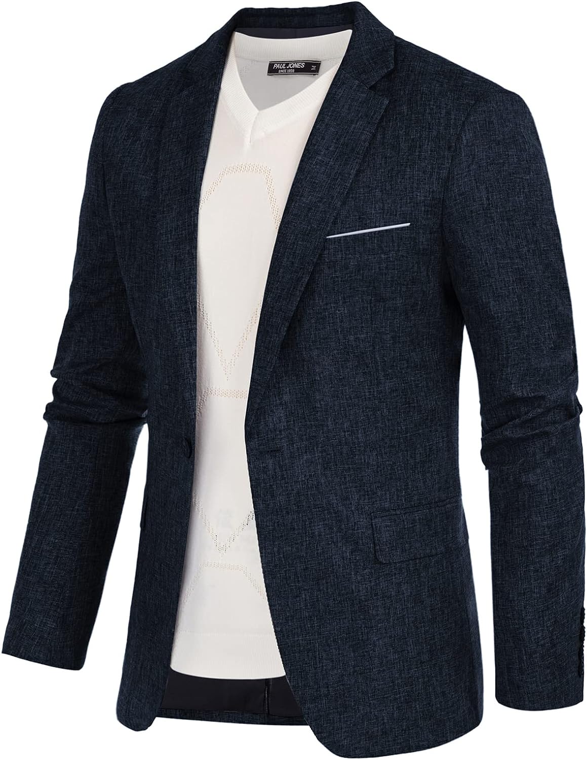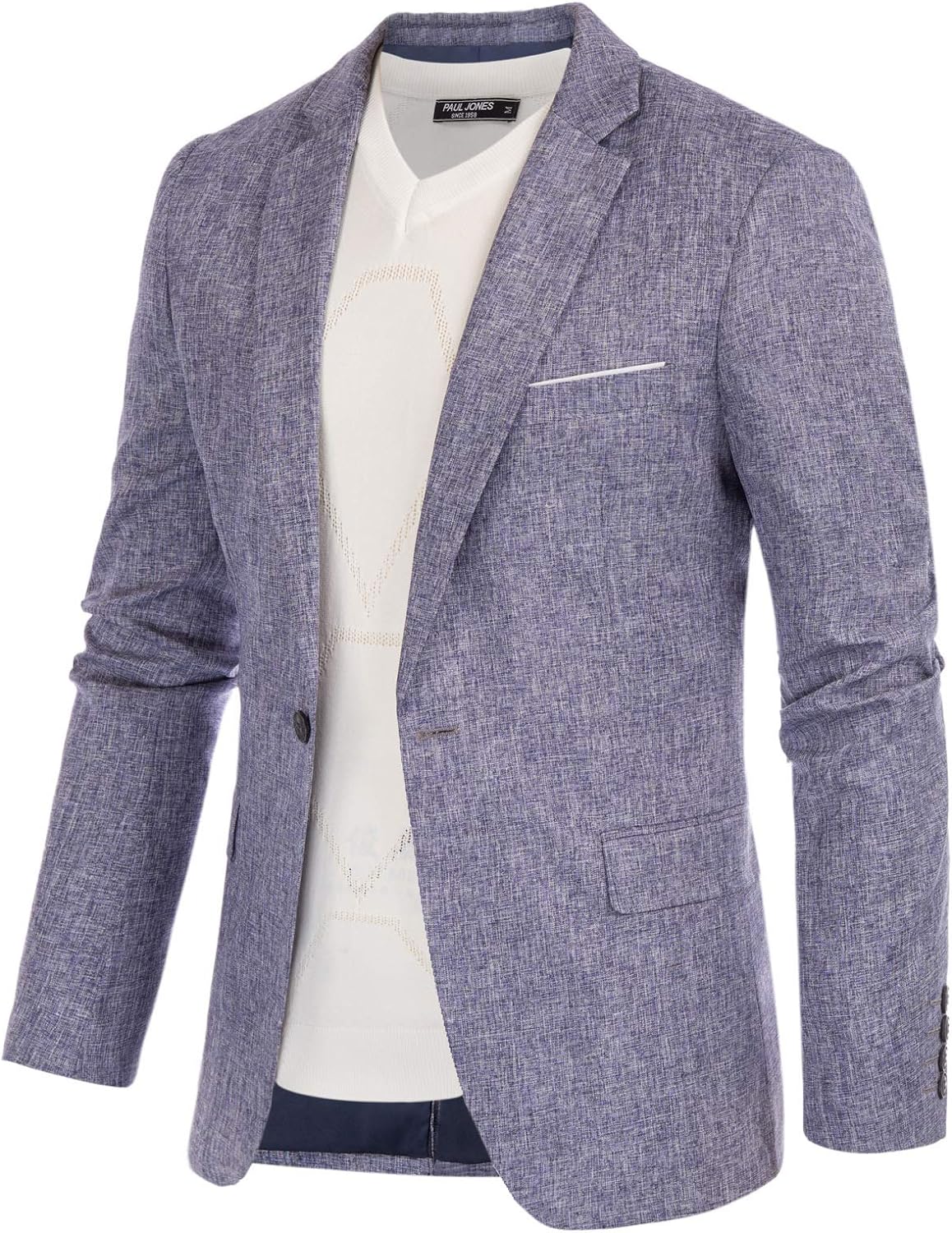 PAUL JONES is an international mens clothing brand that integrates design, production and sales. PAUL JONES men's clothing in the European and American markets has been proactively providing customers with the most suitable products and services, representing the urban elite's meticulous dressing taste, showing the best posture in the workplace and in life. Its products include: t-shirts, knitted sweaters, jeans, casual pants, jackets, suits, shirts, vests etc. To provide our customers with apparel products that can perfectly handle any occasion.This one button blazer jacket that made from 50% Cotton+ 47% Rayon+ 3% Spandex is the notch lapel collar, one button, long sleeve, lightweight, with two real inner pockets, the open left chest pocket adorns with a contrast color square scarf; All design are make this blazer jacket more vitality and stylish, let you spread your charming when you wear it.