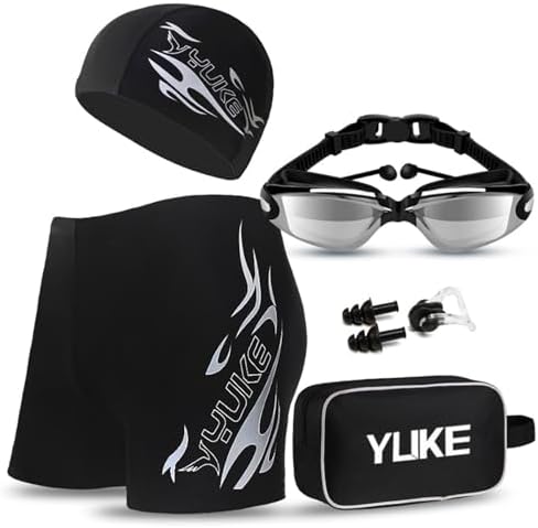 VUCATIN Men's Swimm Short Set,6Pcs Men Swimwear Set Swimming Trunks, Swim Goggles,Swim Cap,Ear Plugs,Nose Clip,Swim Bag, Adult Swim Beach Essentials for Summer Fun