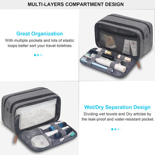 - đWith Large Capacity: 1 Main compartment with elastic straps and mesh pockets hold travel bottles upright, the toiletry organizer is spacious enough to hold all your toiletries or bathroom supplies organized like facial cleanser, shampoo, lotions or shaver, etc.; 2 Side Compartments with multiple pockets and lots of elastic loops better sort your travel toiletries; 1 front zipper pocket that provides extra storage with ease. A great Dopp kit knows how to keep your toiletry necessaries orderly.