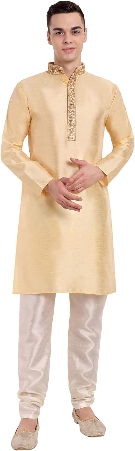 - BEAUTIFUL HANDLOOM KURTA PAJAMA SET : This is a 2-piece set that includes knee length kurta and a pyjama. There is beautiful embroidery work on placket and collar that adds beauty to this set. The traditional design of this kurta captures all of the details of the classic Indian men's garment with long sleeves, a long hemline with side vents and a mandarin collar.