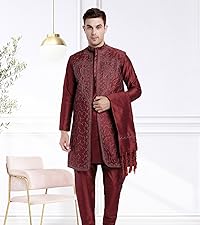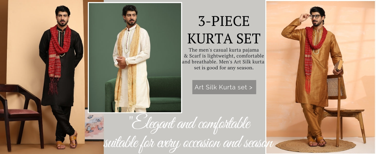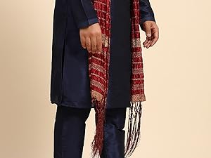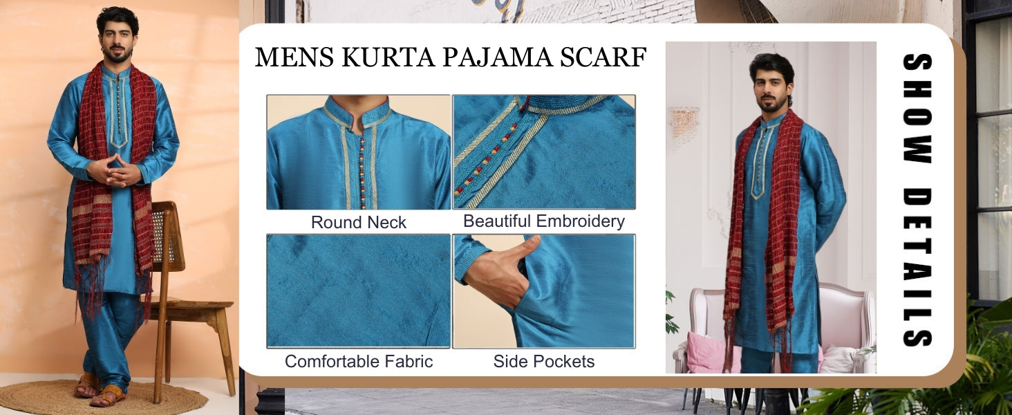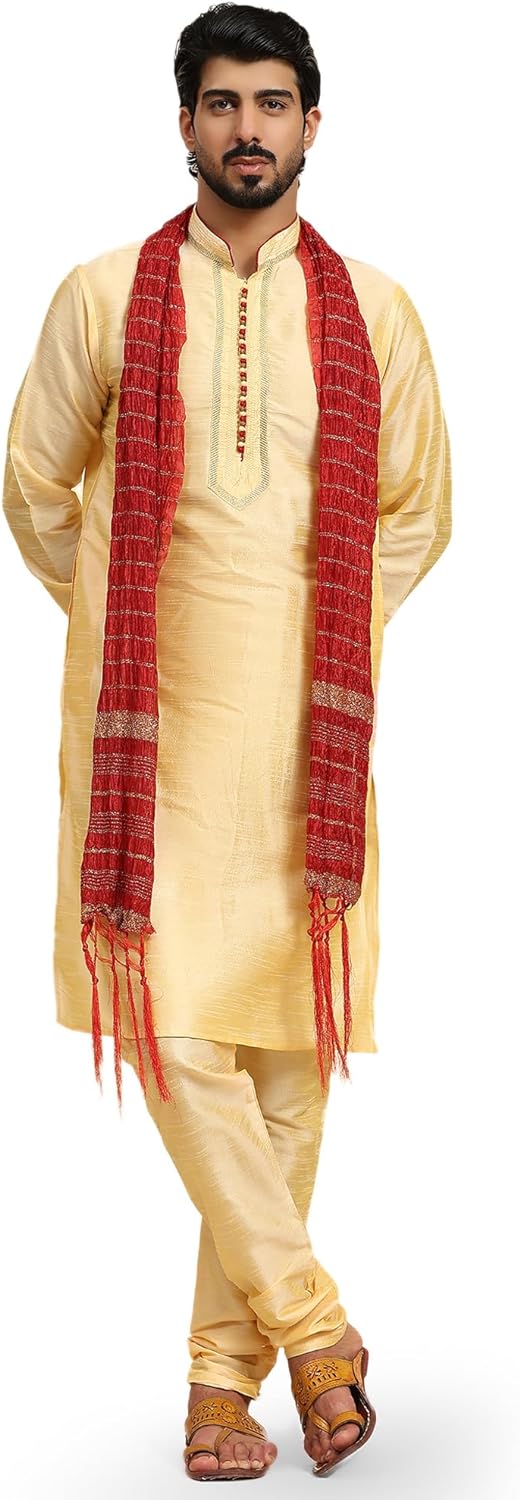 - BEAUTIFUL HANDLOOM KURTA PAJAMA SET : This is a 3-pieces set that includes a long kurta, a pyjama and a long heavy scarf or dupatta. There is beautiful embroidery work on placket, sleeves and collar that adds beauty to this set. The traditional design of this kurta captures all of the details of the classic Indian men's garment with long sleeves, a long hemline with side vents and a mandarin collar.