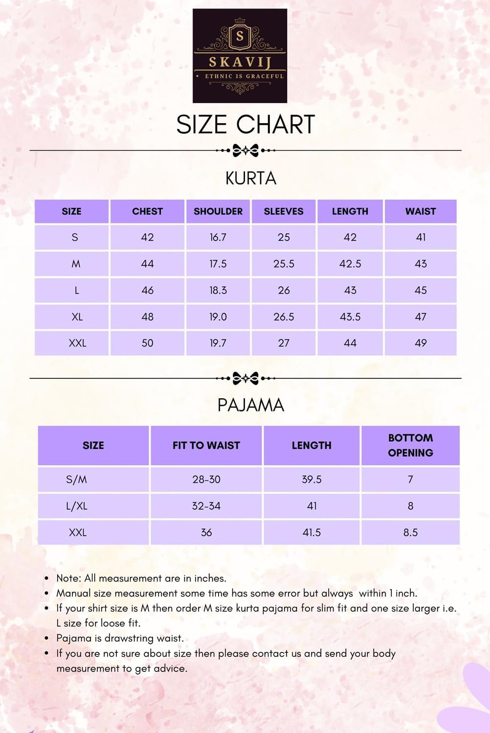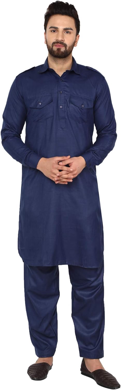Our kurta Pajama tunic set brings together quality and style into one simple piece. A completely traditional Indian design, this kurta set is Handmade Cotton Blend Fabric and feels as light as air to treat you to stylish luxury with each and every wear.Like traditional Pathani kurtas worn in India, this kurta pajama set includes both a top and a bottom.There is beautiful two pocket stiching around the chest . Loose fitting sleeves and slits along the sides allow for an easy fit and let air circulate freely through the garment. The pant included in this kurta pajama set has a relaxed fit through the seat and legs for absolute comfort. Loose comfortable fitting makes it a great wear. This kurta pajama set is worn in both summer and winter. Comes with complimentary free size trouser (pajama) in soft fabric with drawstring in waist. Chest size is displayed based on body measurement NOT actual apparel measurement. Kurta's actual chest measurement is 4 inches more than the displayed chest measurement. e.g. if Kurta's actual chest measurement is 44 inches, we display it as 40 inches or 'M'. In other words, if size measured around the fullest part of your chest is 40 inches, we recommend you buy kurta displayed as 40 inches or 'M'. The actual chest measurement of kurta you will receive would be 44 inches.Kurta sets like this is traditionally worn in India for everyday wear as well as for festivals and special occasions, but in the west, they can be worn in a number of ways. Slip on the set to wear to bed as breathable, soft pajamas in any season. The ways that you can wear this luxurious two-piece set are endless, you can mix and match the pieces with other things in your wardrobe.