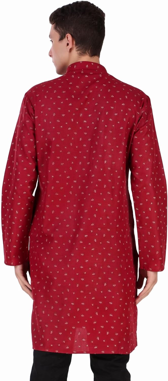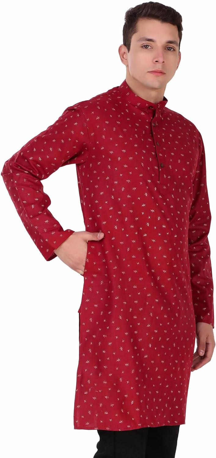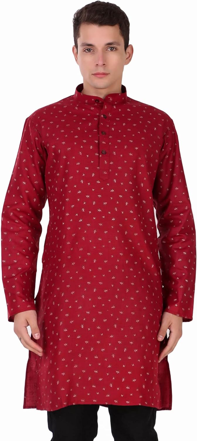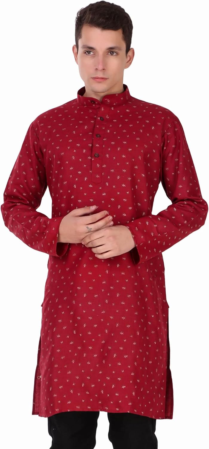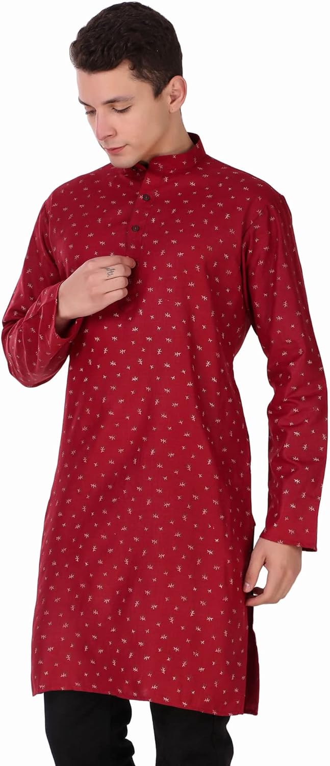 • COMFORTABLE FIT: Cotton and modern fit provide added comfort, ideal for any weather. Sizing is designed for a regular fit. We recommend ordering a size larger for a loose fit. Everyone looks good in this classic men's long kurta shirt. Hip and timeless and flattering in any size, this button-up fits anywhere.
