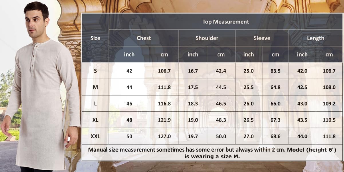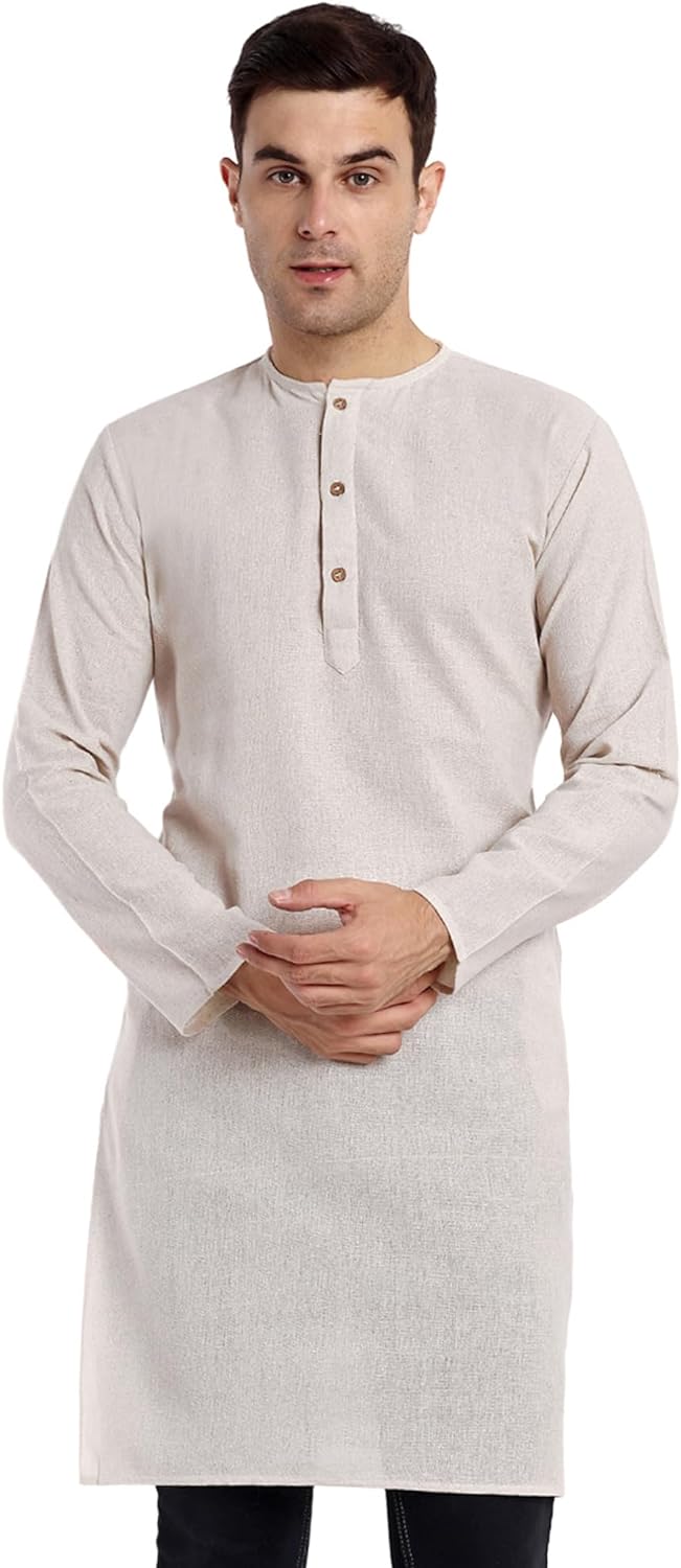 - COMFORTABLE FIT: Cotton and modern fit provide added comfort, ideal for warmer weather. Sizing is designed for a regular fit. We recommend ordering a size larger for a loose fit. Everyone looks good in this classic men's long kurta shirt. Hip and timeless and flattering on any size, this button up fits in anywhere.