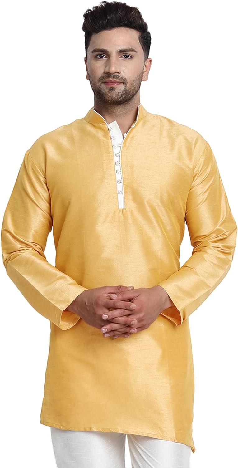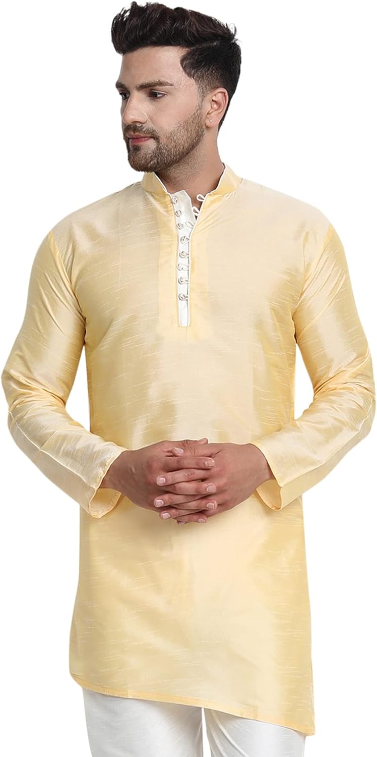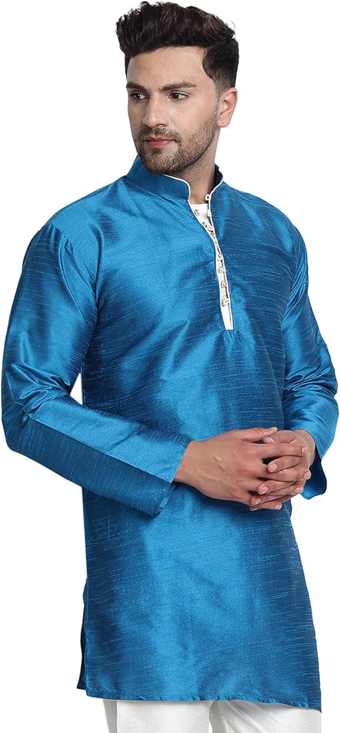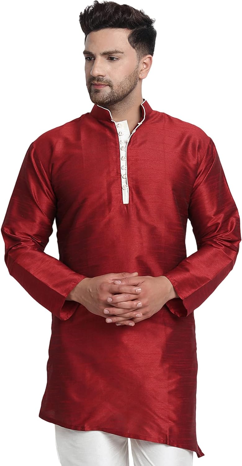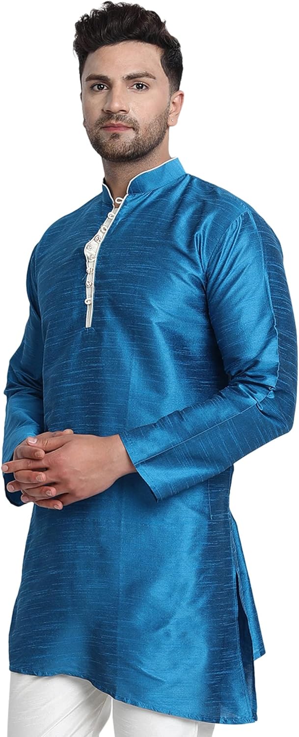 - BEAUTIFUL HANDLOOM KURTA SHIRT : This is long shirt or kurta. There are beautiful buttons on placket that adds beauty to this set. Traditional design on this kurta captures all of the details of the classic Indian men's garment with long sleeves, a long hemline with side vents and a mandarin collar.