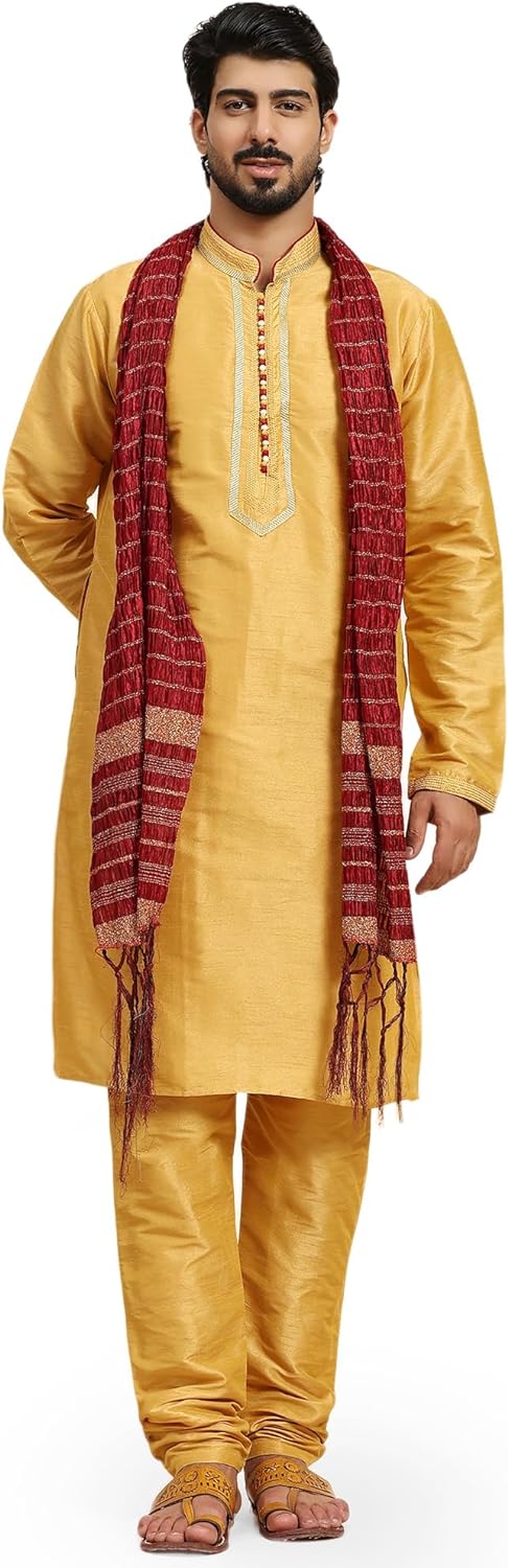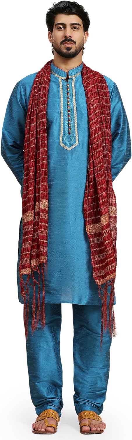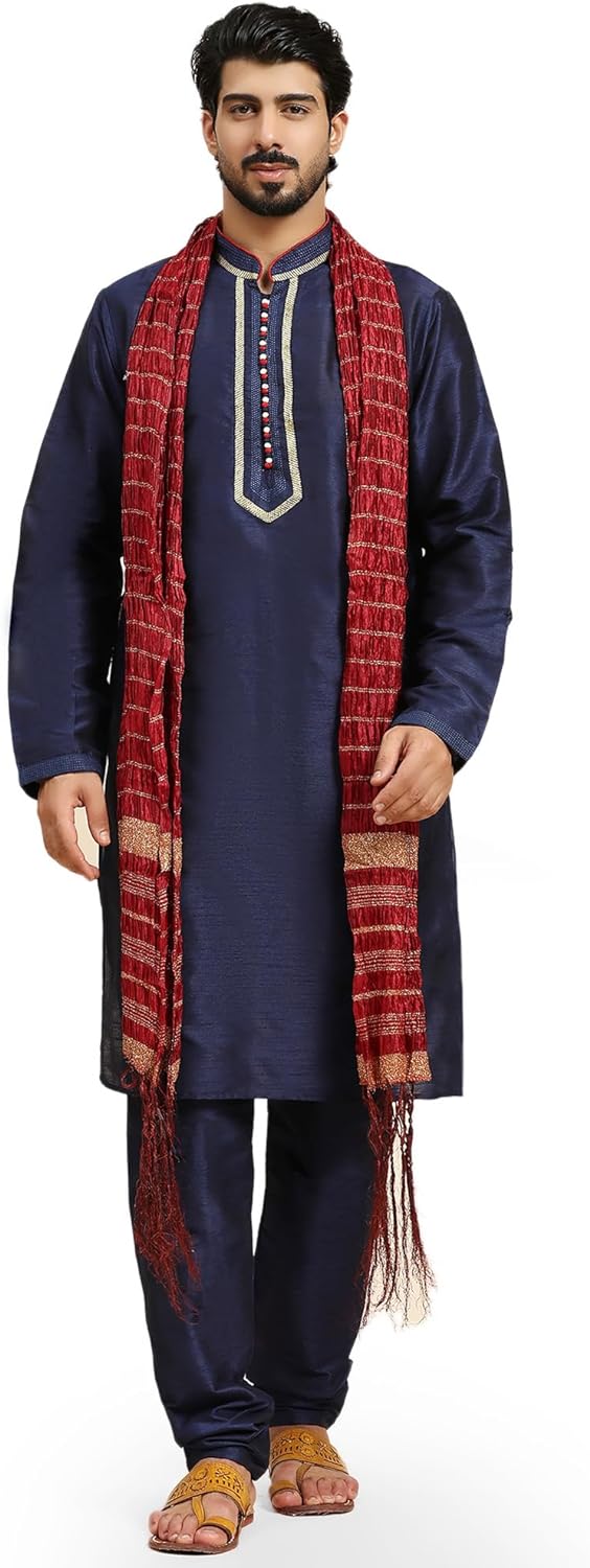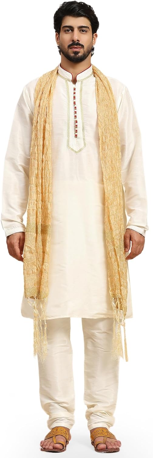 - BEAUTIFUL HANDLOOM KURTA PAJAMA SET : This is a 3-pieces set that includes a long kurta, a pyjama and a long heavy scarf or dupatta. There is beautiful embroidery work on placket, sleeves and collar that adds beauty to this set. The traditional design of this kurta captures all of the details of the classic Indian men's garment with long sleeves, a long hemline with side vents and a mandarin collar.