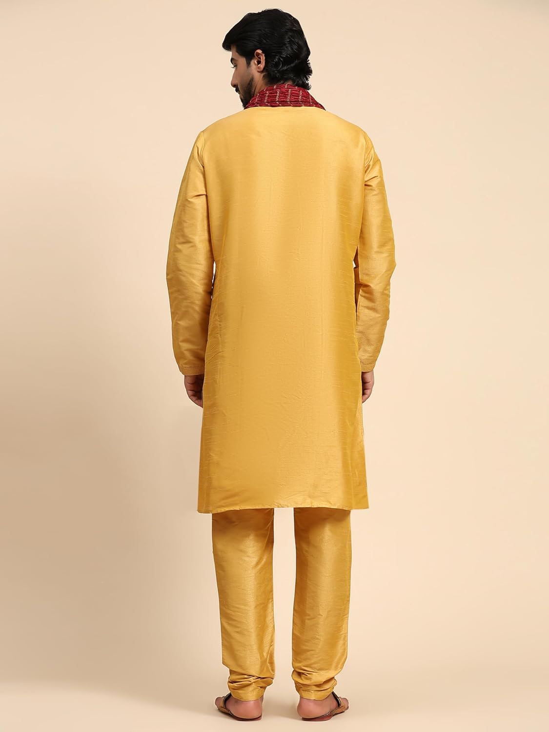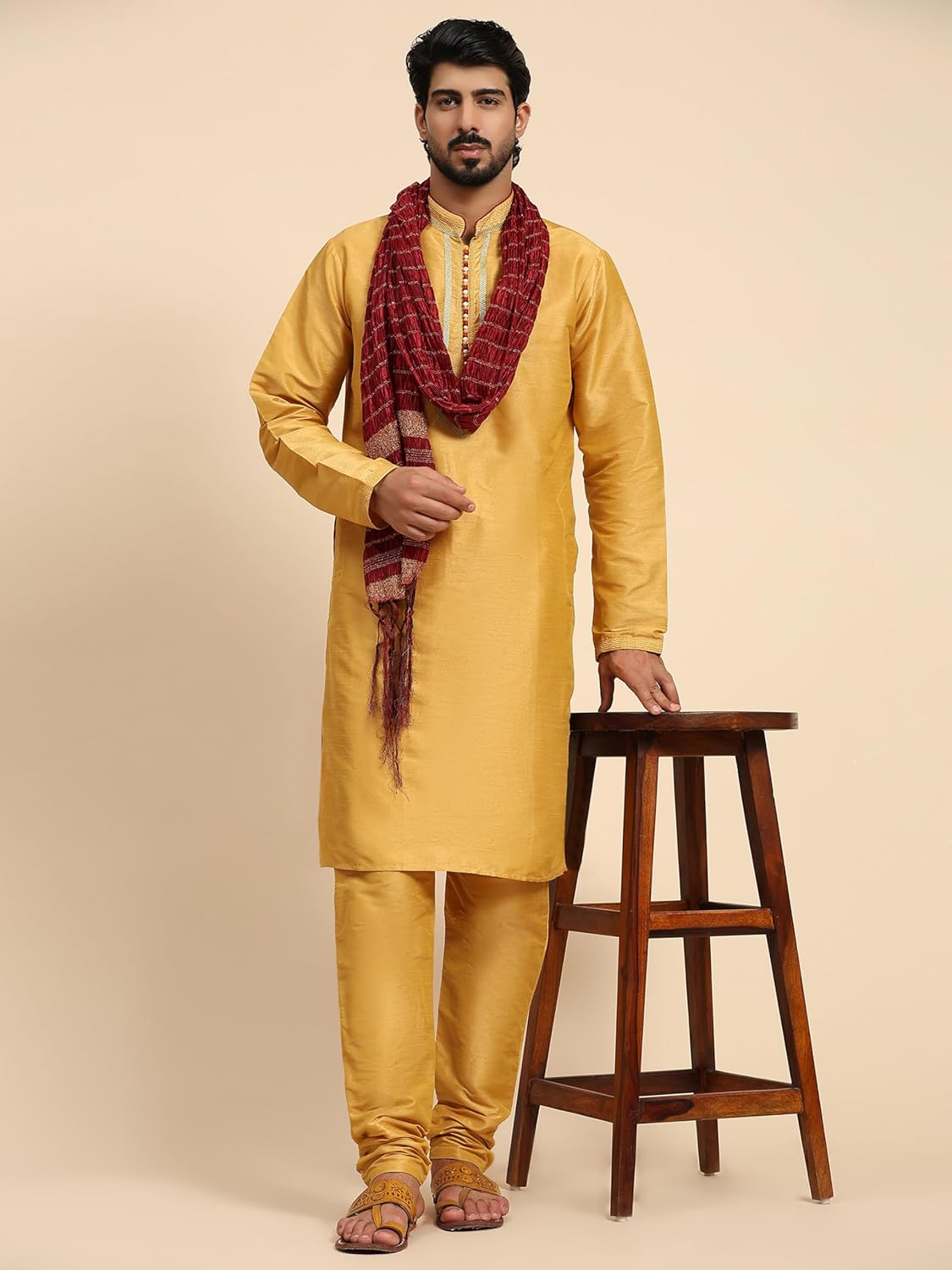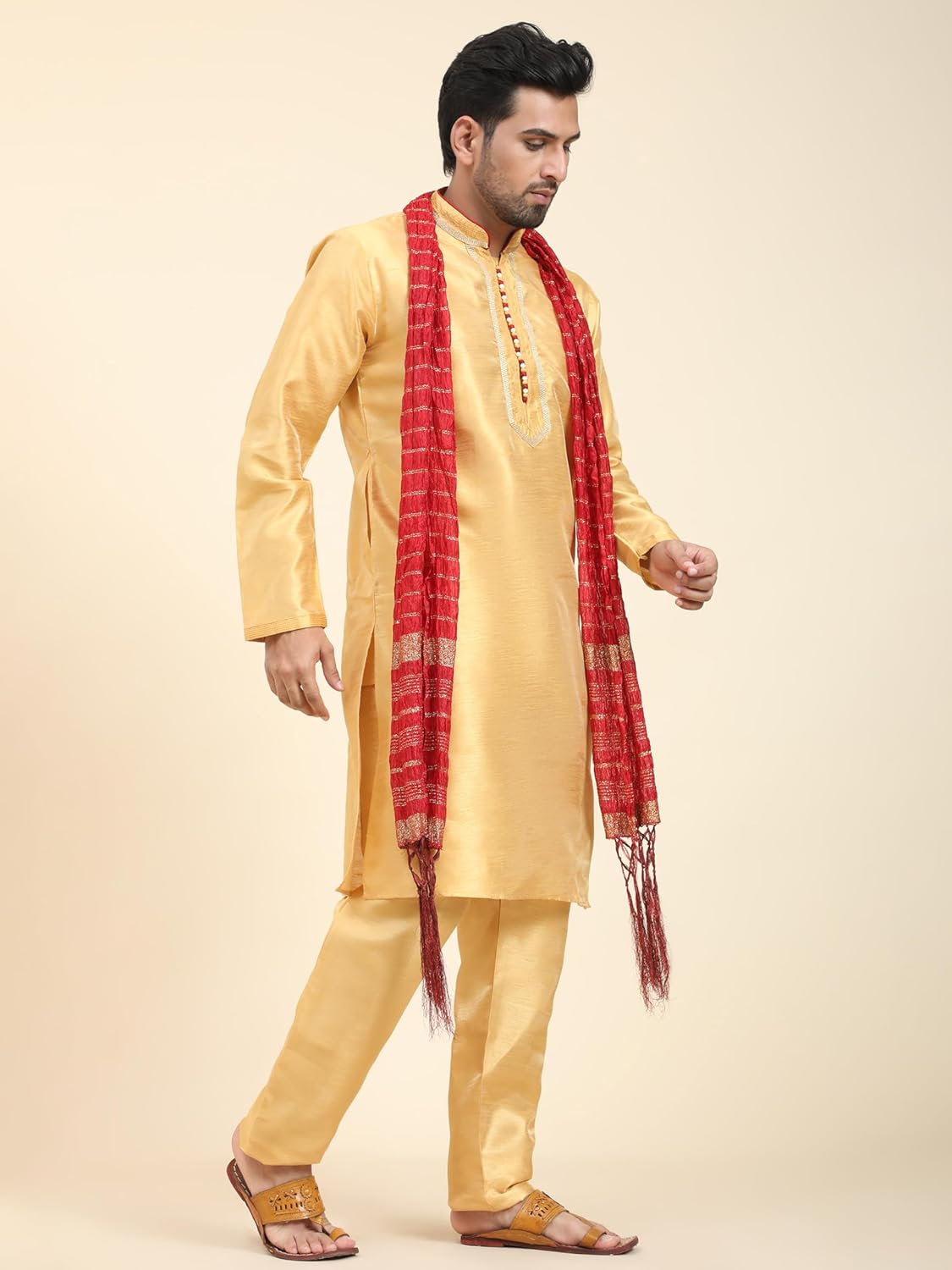 - BEAUTIFUL HANDLOOM KURTA PAJAMA SET : This is a 3-pieces set that includes a long kurta, a pyjama and a long heavy scarf or dupatta. There is beautiful embroidery work on placket, sleeves and collar that adds beauty to this set. The traditional design of this kurta captures all of the details of the classic Indian men's garment with long sleeves, a long hemline with side vents and a mandarin collar.