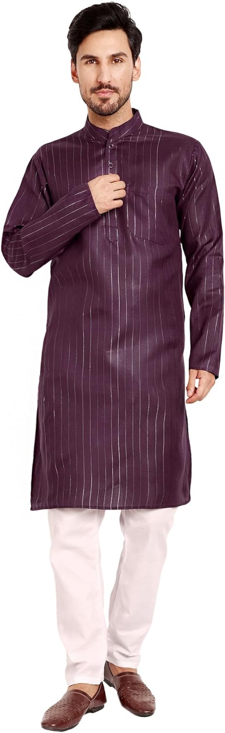 - HIGH QUALITY MATERIAL: Lightweight and breathable material gives this kurta pajama set soft, comfortable feel. Made from cotton blend fabric. The kurta is lightweight with vented side. Designs feature modern and innovative details that appeal to everyone.