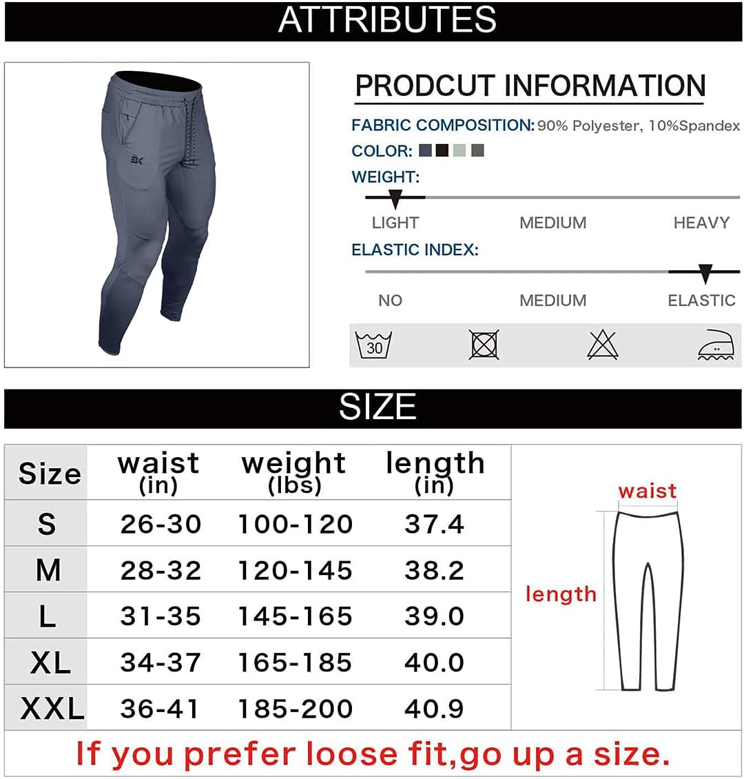 BROKIG Mens Lightweight Gym Jogger Pants, Men's Slim Fit Workout Sweatpants with Extra Zipper Pocket Casual Sweat Pants for Running-Lightweight and stretchy for daily training-Side Zipper Pocket-Tapered Cuffed Ankles-Ribbed Waistband for secure support-Comfort Tech FabricationSuitable for:-Jogging,Aerobics,Spinning-Fitness,Weight training,Running-Workout,Power lifting,Squatting-Climbing,Cycling,Hiking-Walking,Daily Wears etc.Size Guide:Model: 6'1”, 185 lb, wearing size MSize: S M L XL XXLLENGTH --S:39.2" M:40" L:40.7" XL:41.5" XXL:42.3"Waist:--S:28-32" M:31-35" L:34-37" XL:36-41" XXL:38-43"Foot:--S:11.4" M:11.6" L:11.8" XL:12" XXL:12.2" Care Instruction:Machine wash or hand wash in cold waterNote:1) Above size for manual measurement,due to personal measurement technique is different, there maybe 0.5-1.5 inch error of the physical. 2) The actual color of the item may be little different from the pictures shown on website caused by your monitor and light brightness when browsing.