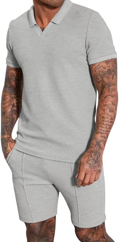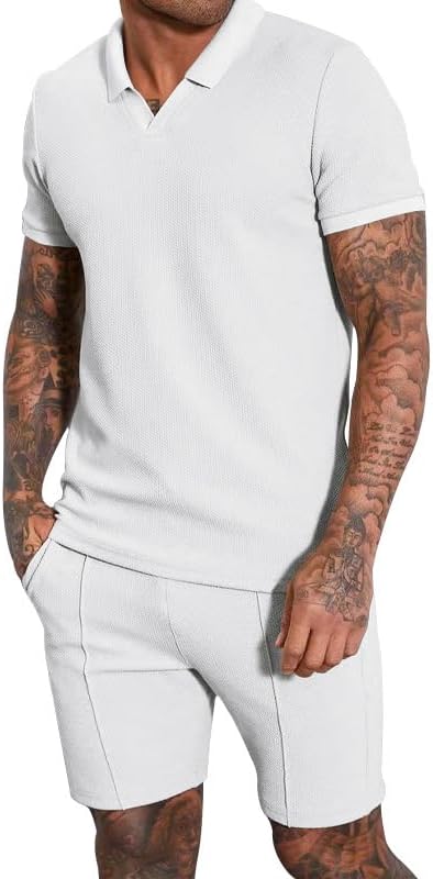 Men's 2pcs Outfits Shorts Set Tracksuit Sport Suit Waffle Short Sleeve Shirt Set Shorts Regular Slim Fit Polo Shirt Casual Summer Beach Outfits