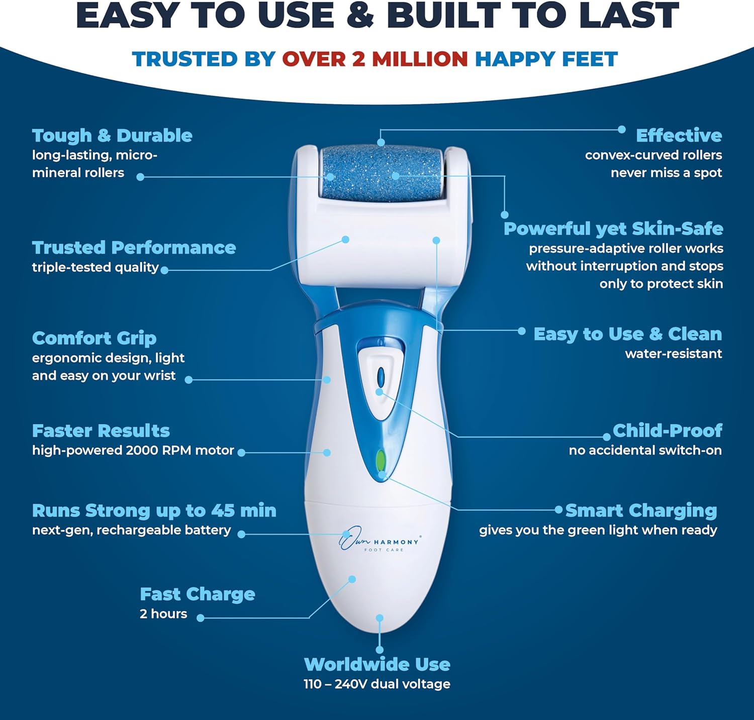 PROFESSIONAL SPA RESULTS: ONLY VALID WHEN PURCHASED THROUGH OWN HARMONY. Love getting pedicures? With this cordless callus remover you feel like you’ve gone to a professional salon minus the luxury beauty costs; Pamper your feet with spa like pedicure in the comfort of your own home; Watch years of callused, dry, hard skin give way to baby soft, smooth Happy Feet in minutes; IMPORTANT: Own Harmony - UAE is the only authorized seller; The warranty is void for orders from any other seller