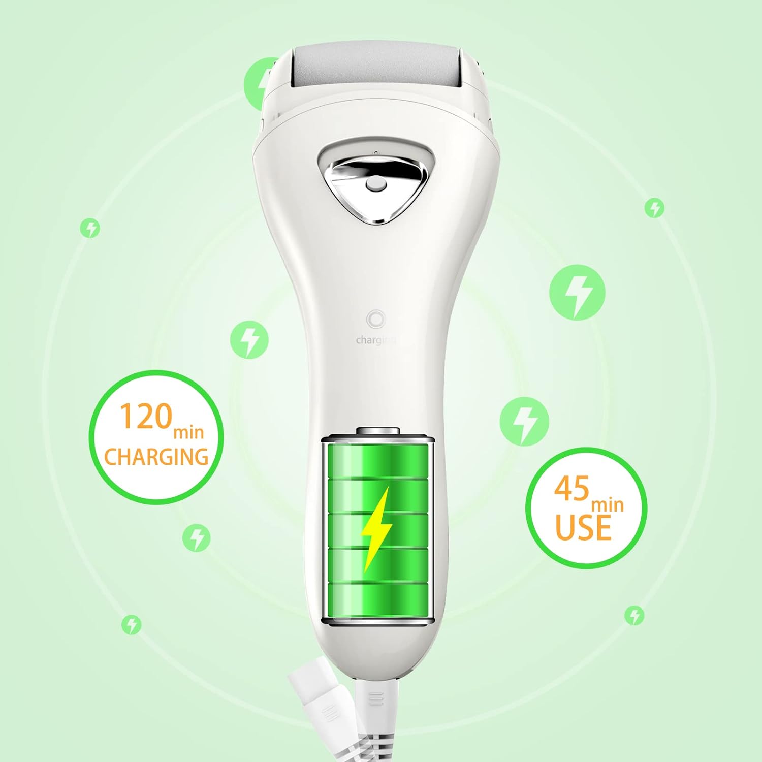 .FAST & RECHARGEABLE PRO FOOT CARE CALLUS REMOVER SET ━ Efficient foot pedicure tool, simply recharge the battery of cordless electric pedi perfect foot file with the provided adapter charging for 8 hours. 600mAh Li-ion battery can be used up to 45 minutes.