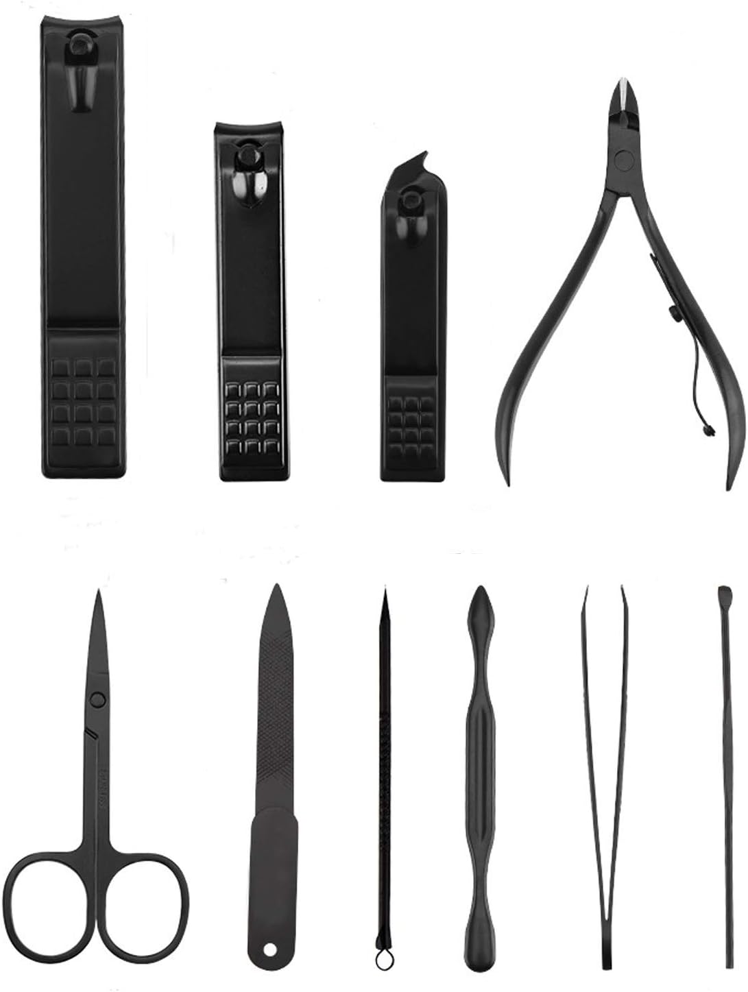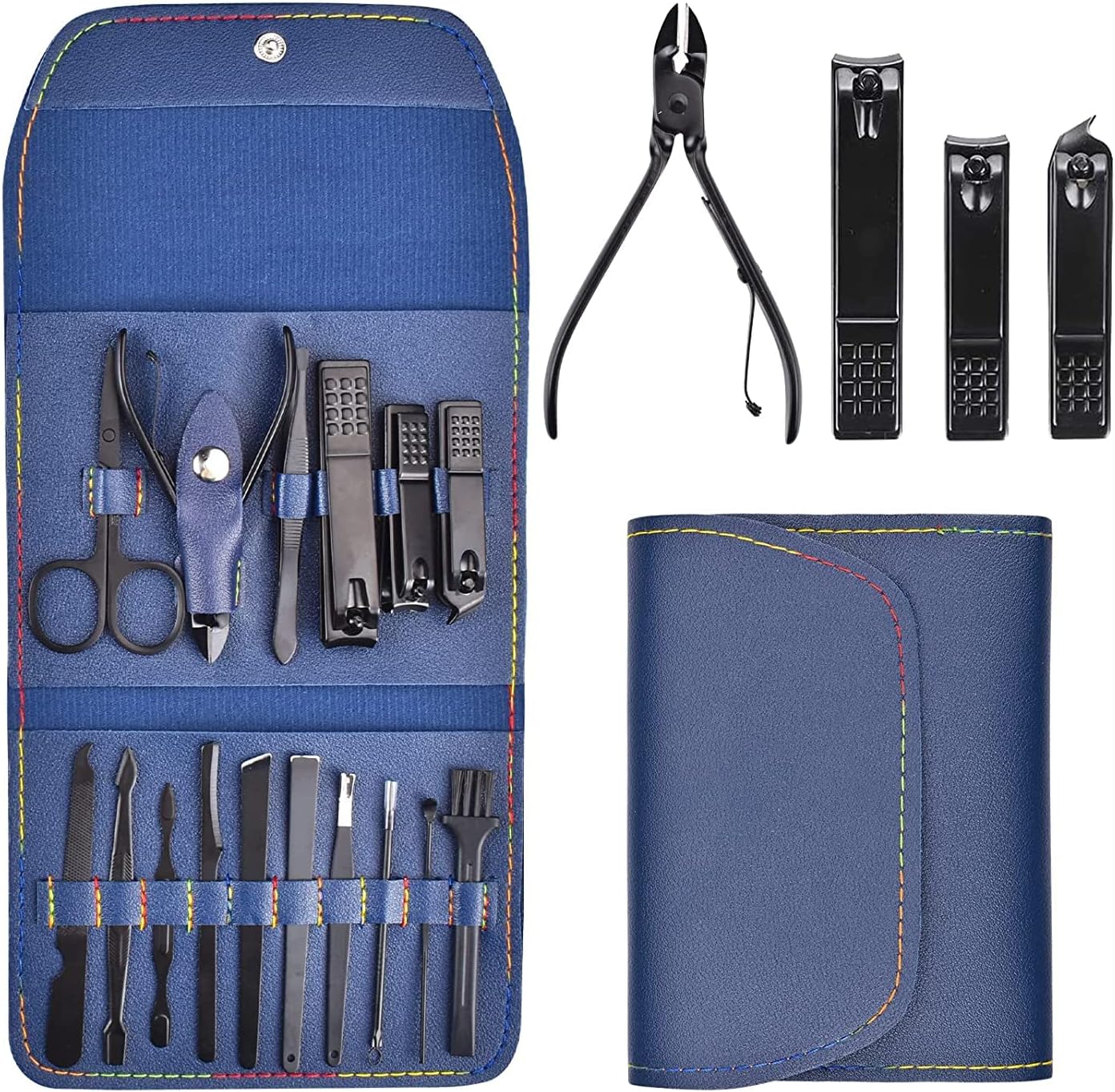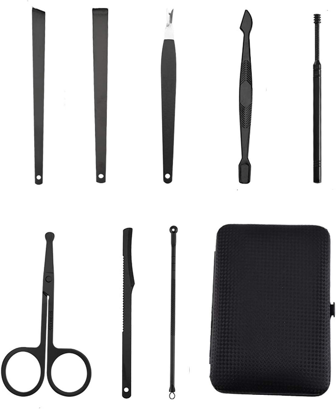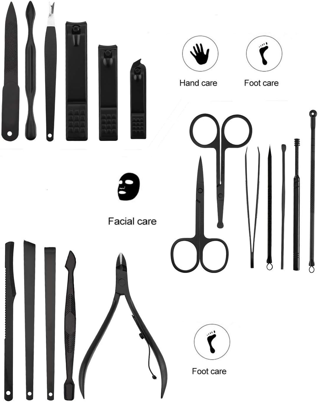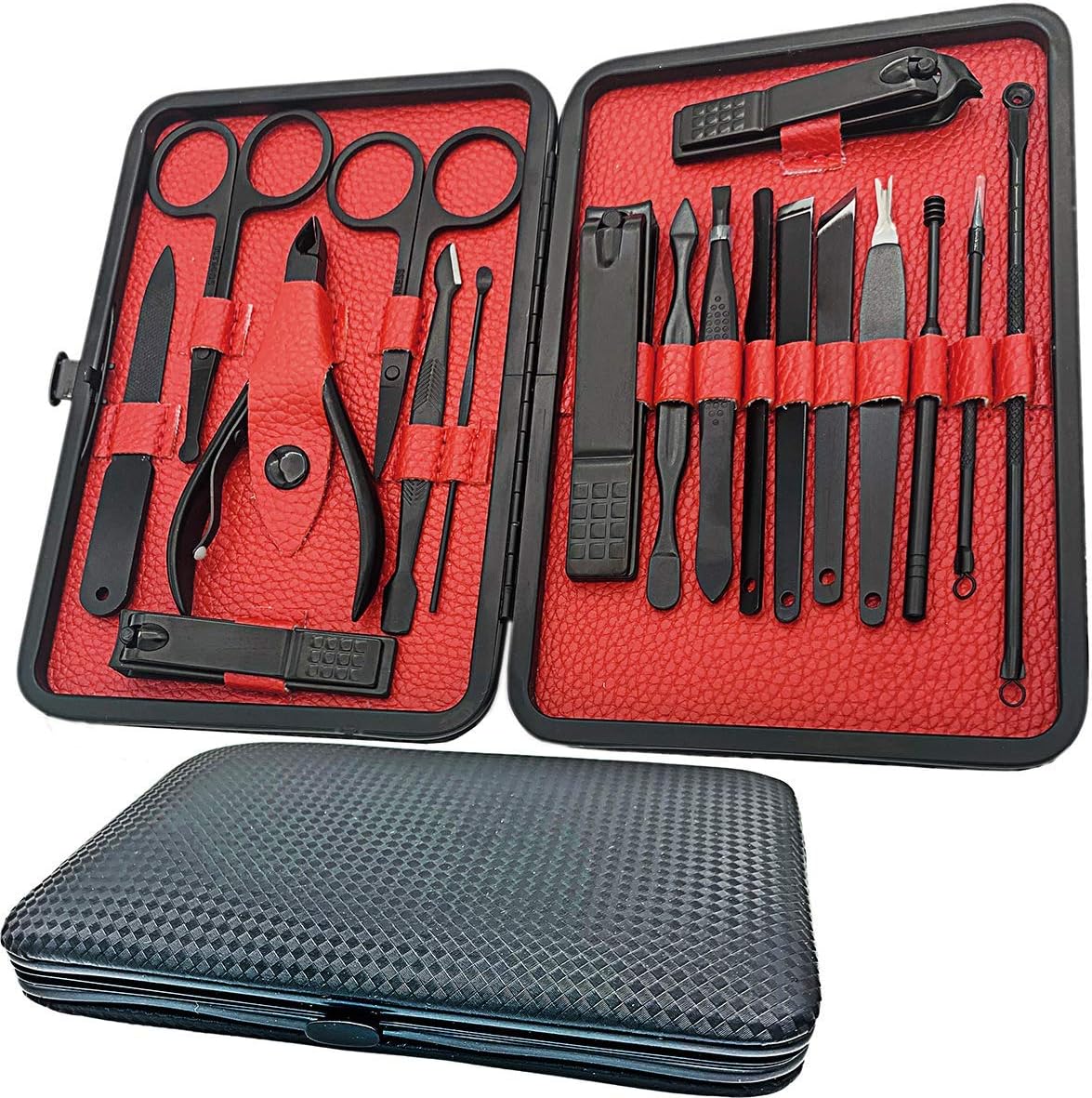 Features: : This Kit Contains 18 pieces nail and toenail tools for three functions, including hand care,facial care, and foot care which can meet all of you needs. : Our FLAFARY manicure and pedicure tools are made of professional surgical grade Stainless Steel to allow Safe Sterilization, Prevent Corrosion and Minimize Risk of Infections. : This manicure set comes with a portable synthetic leather Travel Case that is easily opened with a push of a button. It is also very lightweight so you can carry it with you in your bag everyday or pack it with you when you go traveling. : The Box is made of high-quality fabric and PU leather. It has elegant appearance with black-and-red design. It is the best gift for your relatives, friends, Dad(on Father’s Day),parents, husband and wife. : FLAFARY stands behind our premium products with a 100% Satisfaction Guaranteed. If you're not satisfied for whatever reason, we'll gladly exchange or refund your order (subject to Amazon Terms). No questions, no hassles. Specifications: Material: Stainless Steel Color: Black Item Weight: 307.88g / 10.86oz Size: 15.5 * 11.1 * 3.47cm/ 6.06 x 4.37 x 1.34 inches; Package includes: Package size: 15.5 * 11.1 * 3.47cm /6.1 x 4.37 x 1.34 inches Shipping weight: 307.88g / 10.86oz