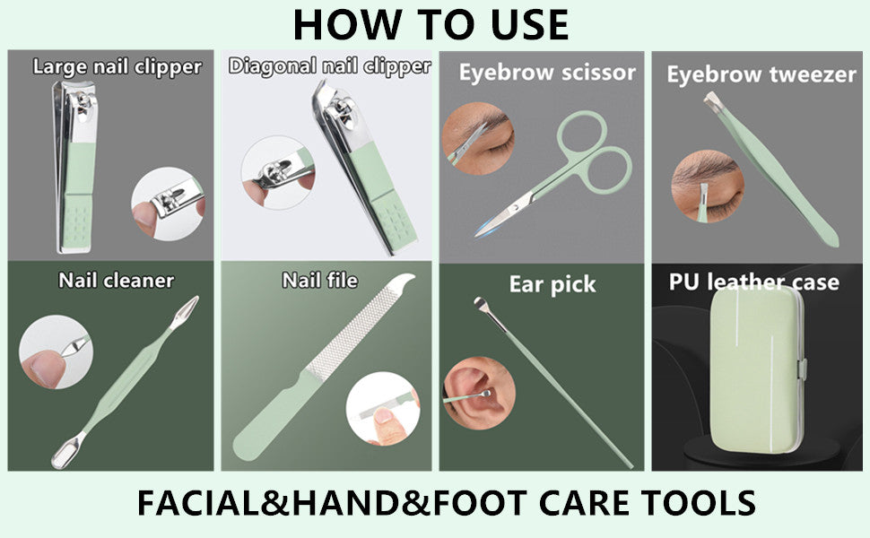 【Beauty&Personal Care Tools】: The manicure set contains 7 tools(large nail clippers, small oblique nail clippers, eyebrow scissors, eyebrow tweezer, ear pick, nail file,nail cleaner) for hand care, foot care, and facial care, which can meet your personal care needs.High-quality manicure kit and nail grooming kit for men, boys, teenagers, seniors, women, and girls.