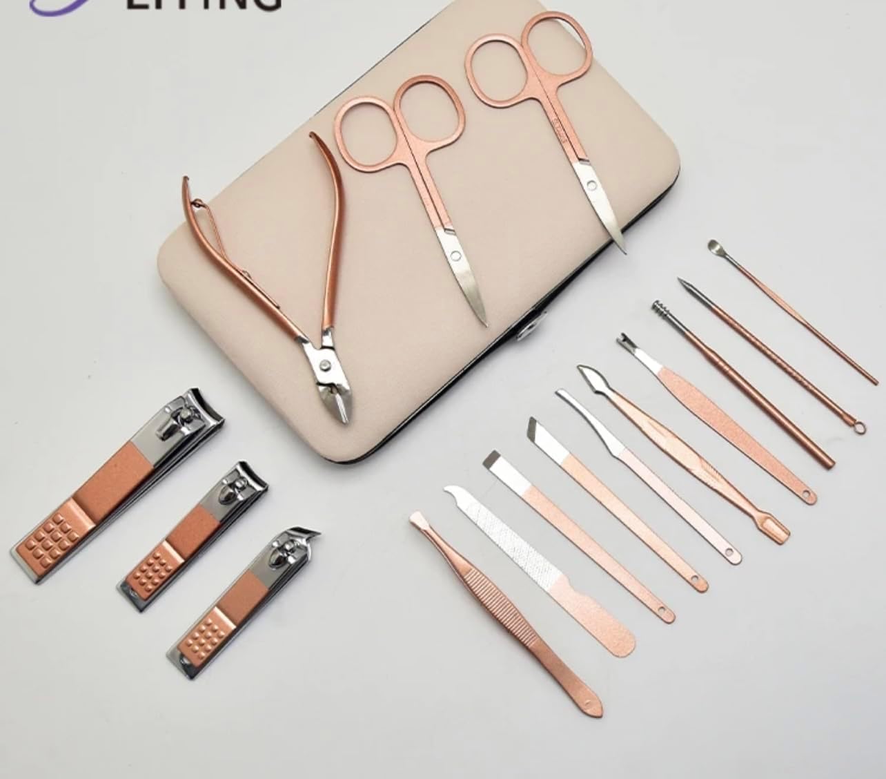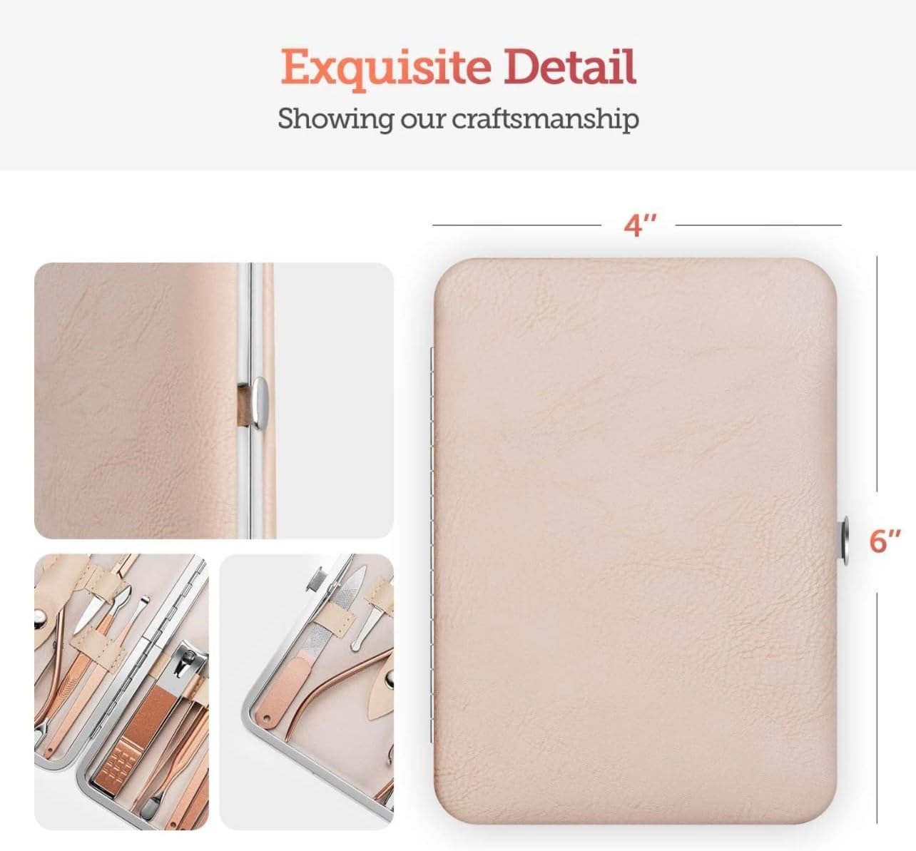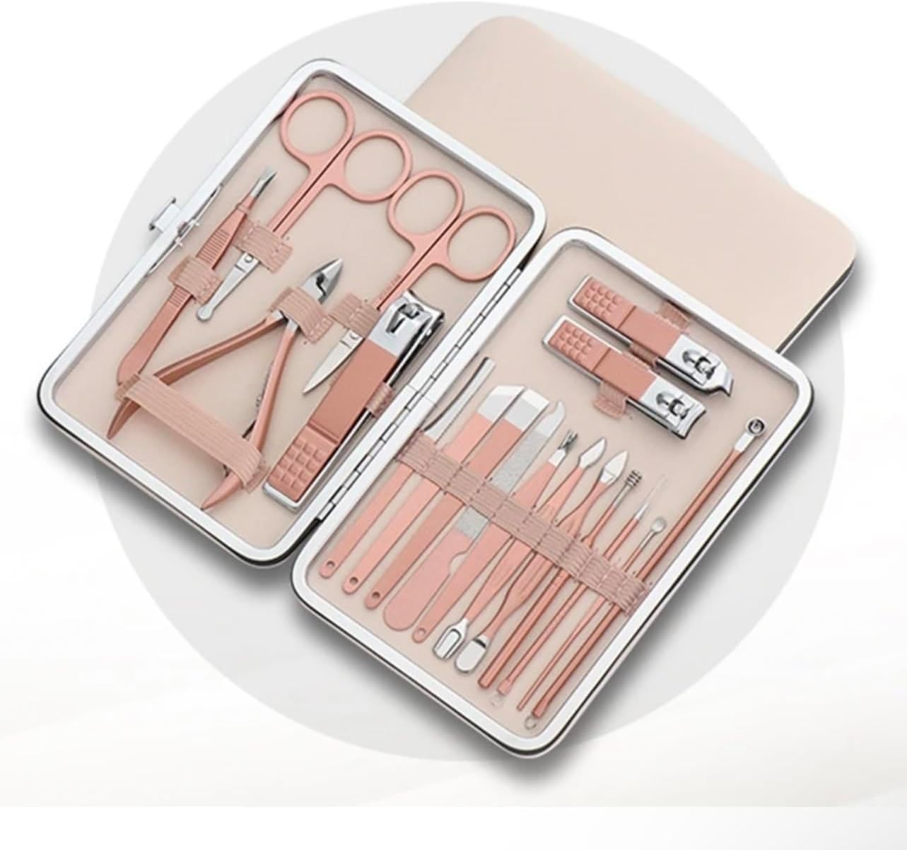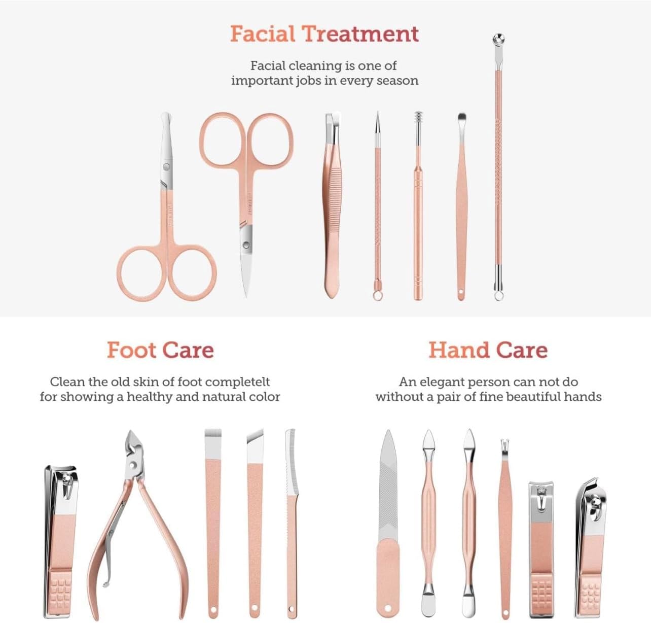 Features:Professional Manicure Kit contains 18 tools for hand care, facial care and foot care which can meet all of you needs.It is a gift for yourself,families and friends!Small size case makes it portable and light weight make it convenient to carry,great for travel and daily life!Stocking stuffers for women and men Manicure set, multiple tool options:Professional Manicure Kit contains 18 tools for hand care, facial care and foot care which can meet all of you needs.No need to pay for a single nail clippers or Nose Hair Scissors,money can be saved.Even thick nails can be easily cut off directly,No need to use a lot of force.The fashion case made by grade pu material, pretty, sturdy and built to last, not fade and difficult to wear.The PU-leather suitcase is portable and can be easily opened with one press of the buttonGrooming Nail kit, lightweight in design making it your perfect travel partner, offering exceptional foot, hand and facial grooming tools.you will not want to separate in your travels and also everyday life.