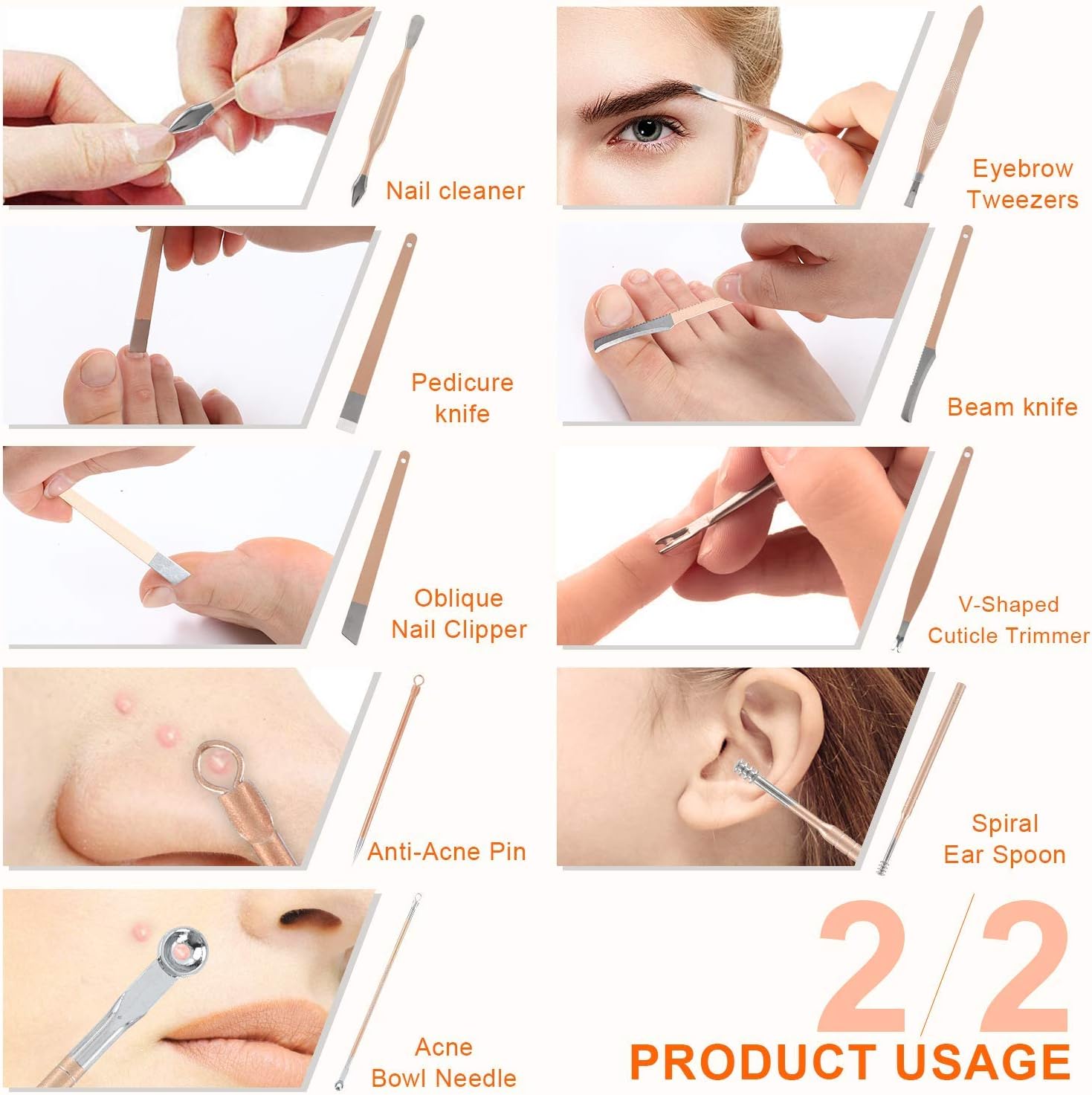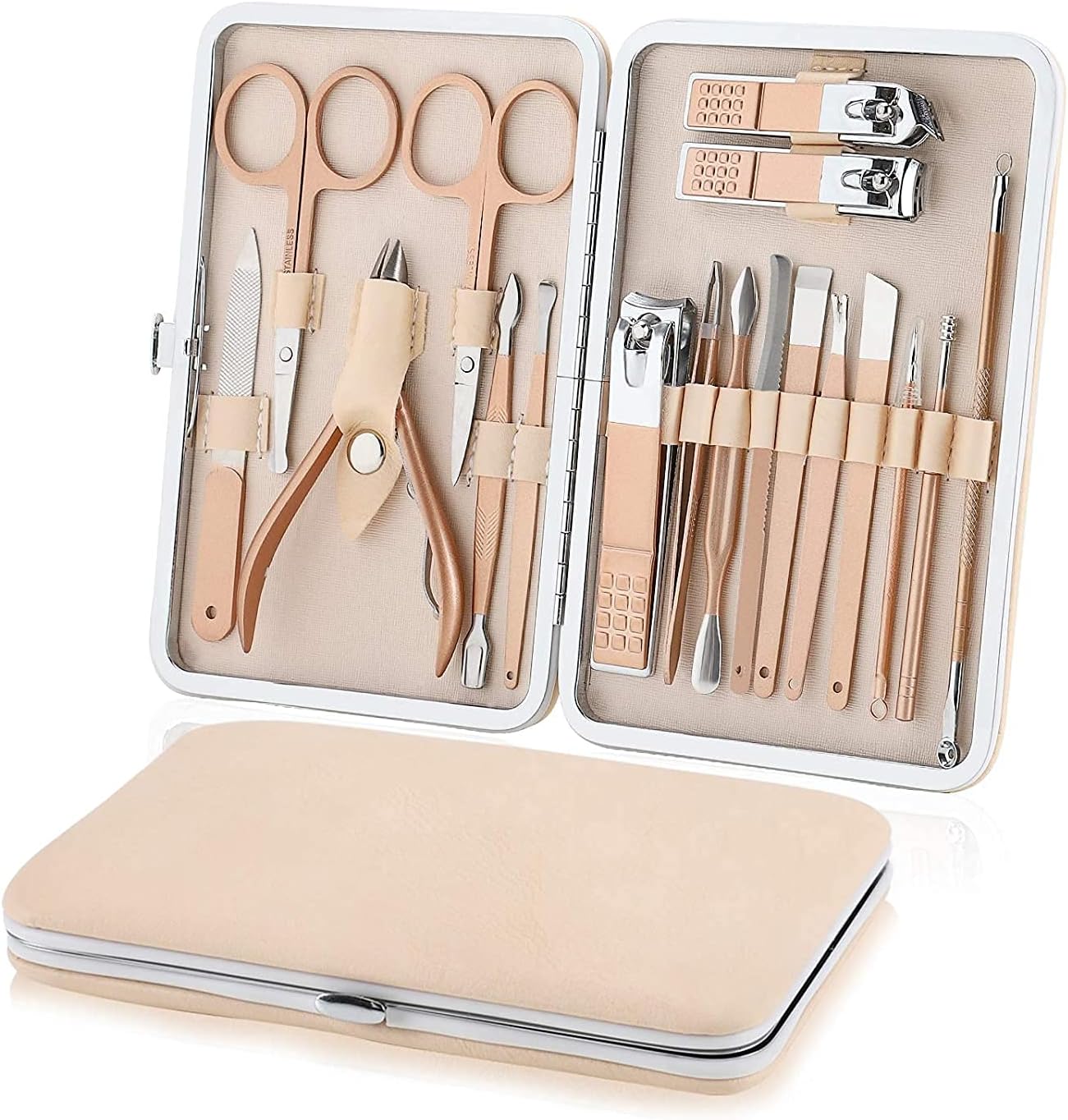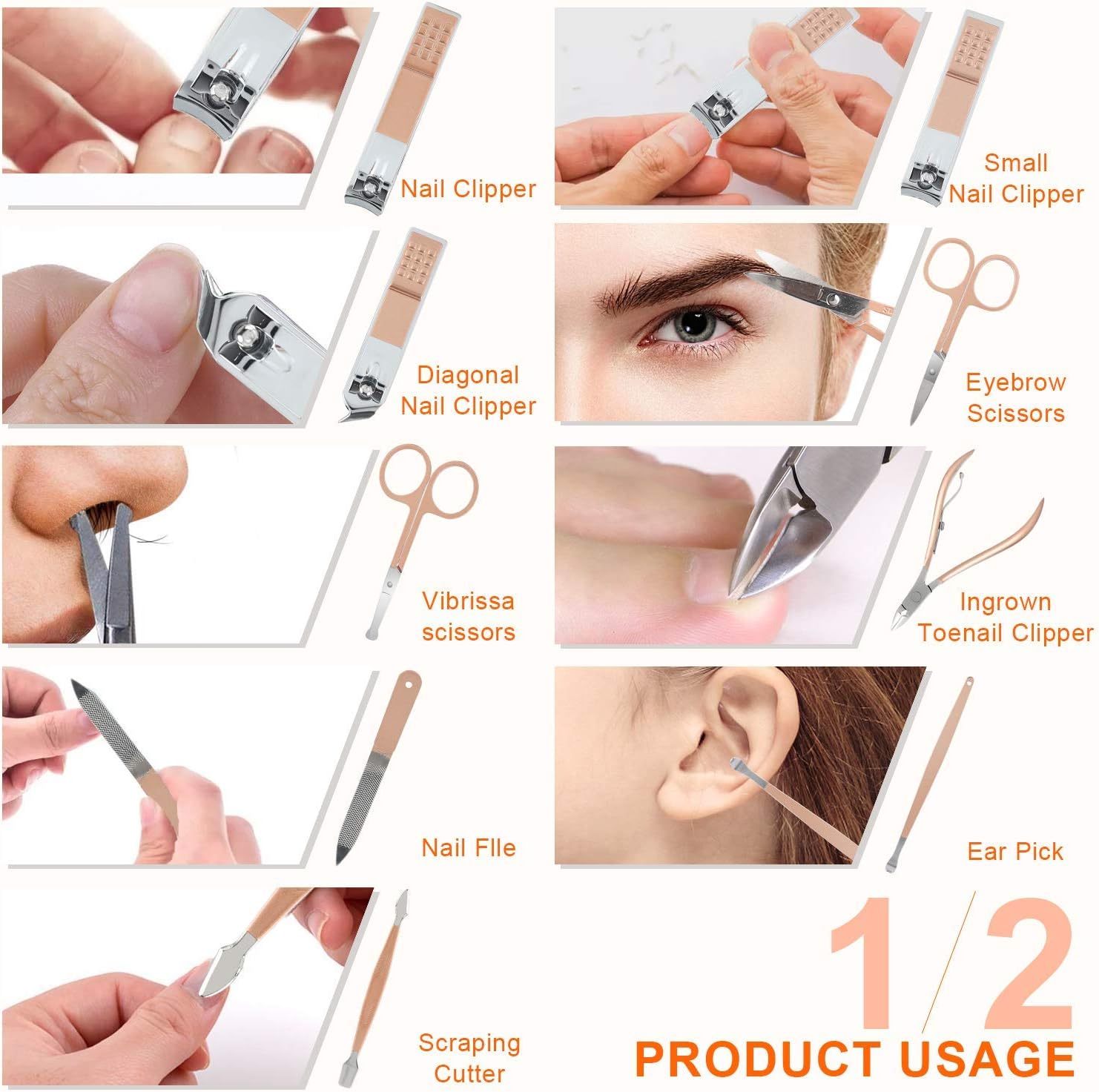 Please Note:Keep the pedicure set in dry place and clean each piece after every use.Product Specification:Material: stainless steel manicure tool, PU leather caseColor: Golden RoseCase Dimension: 16x10cmWeight: 320GPackage Contents:1 x Nail clipper1 x Oblique nail clipper1 x Pedicure knife1 x Diagonal nail clipper1 x Ingrown nail clipper1 x Small nail clipper1 x Nail file1 x Beam knife1 x Scraping cutter1 x Nail cleaner1 x Vibrissa scissor1 x Eyebrow scissor1 x Eyebrow clip1 x Ear spoon1 x Spiral ear pick1 x Anti-acne pin1 x Acne bowl needle1 x V-shaped cuticle trimmer1 x Carrying case