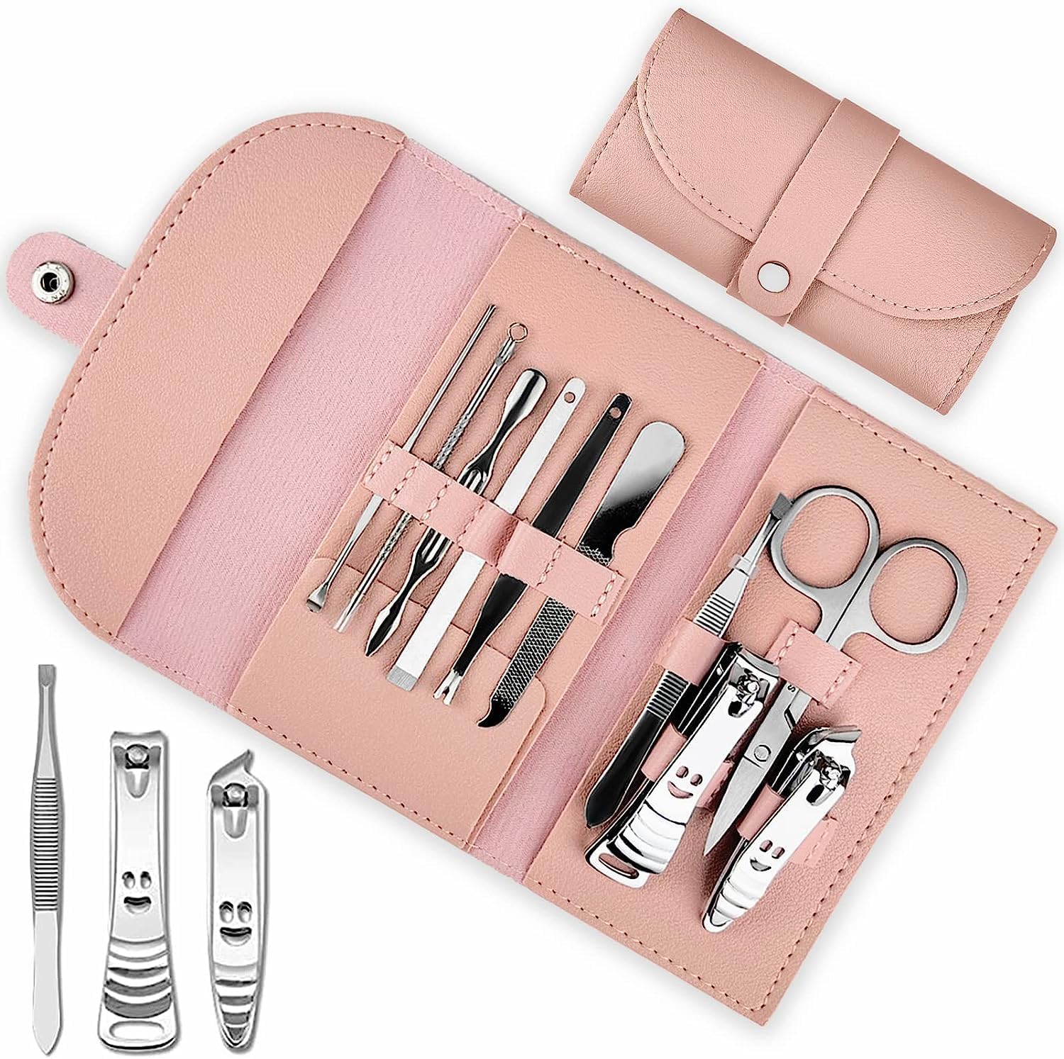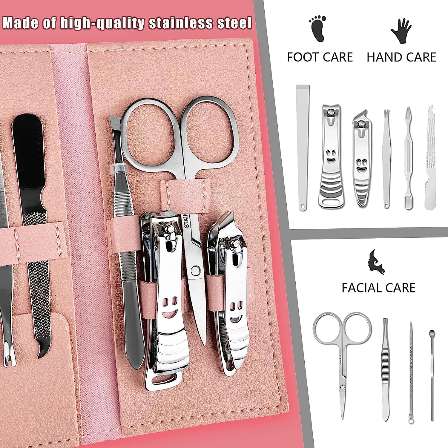 Stainless Steel Manicure Set, Nail Clippers Portable Professional Pedicure Kit, Nail Care Tools Grooming Kit with Luxurious Travel Leather for Travel & Home, 10pcs (Pink)