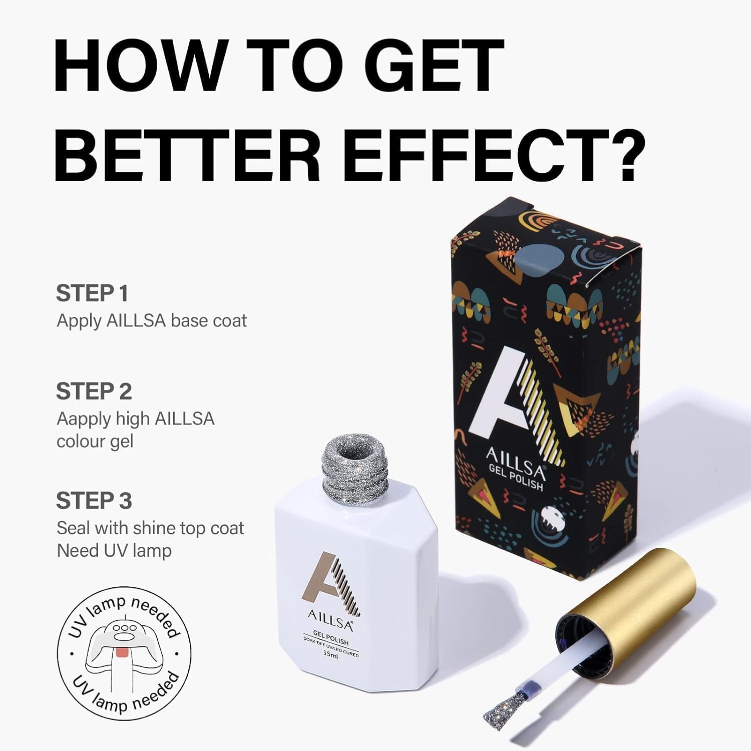 ✔【Long Lasting 21-28 Days】AILLSA Glitter gel polish needs to be cured under L E D/U V light, under the correct use steps, it can last for 21-28 days and keep the shiny luter. You'll never have to worry about your nails peeling off while showering and doing housework. Let AILLSA serve you a longer time!