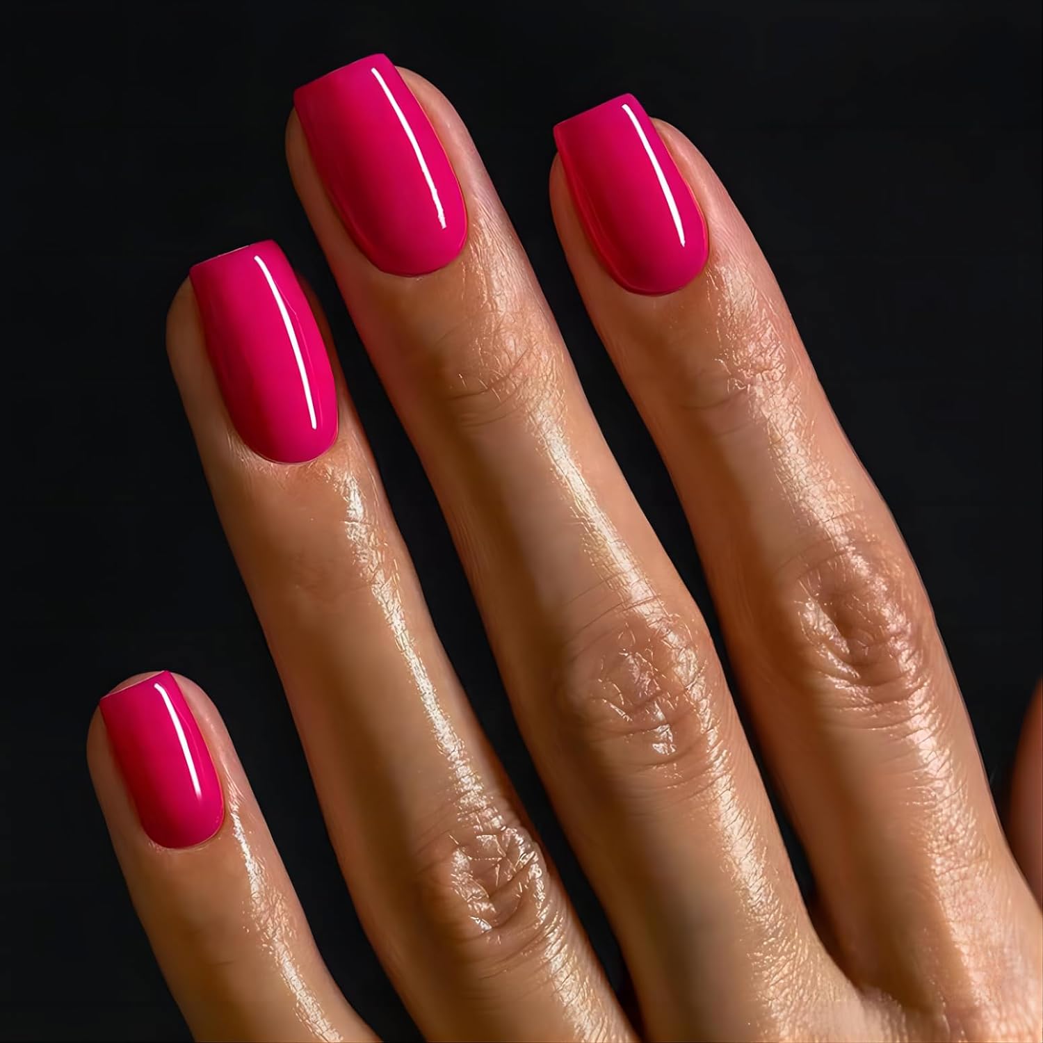 Neon Pink Press On Nails Medium Square Solid Color Gradient Glossy 24pcs Press On Nails Medium Natural French Manicure, Fake Acrylic Nails with Glue Kit & Gel Sticker