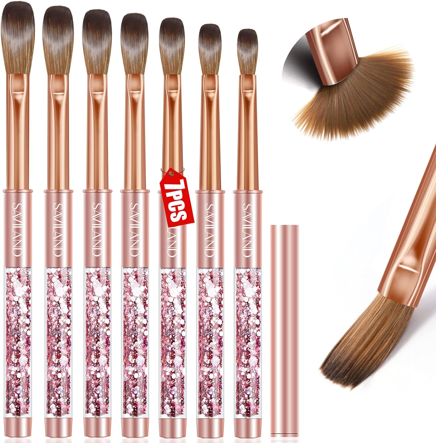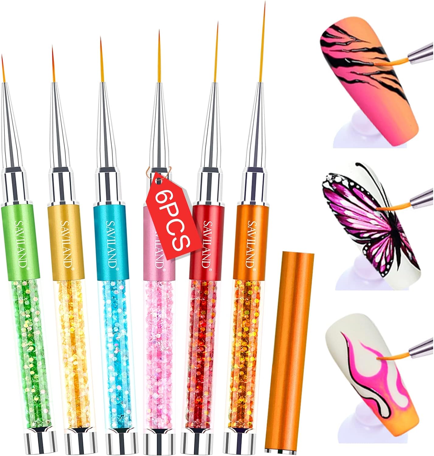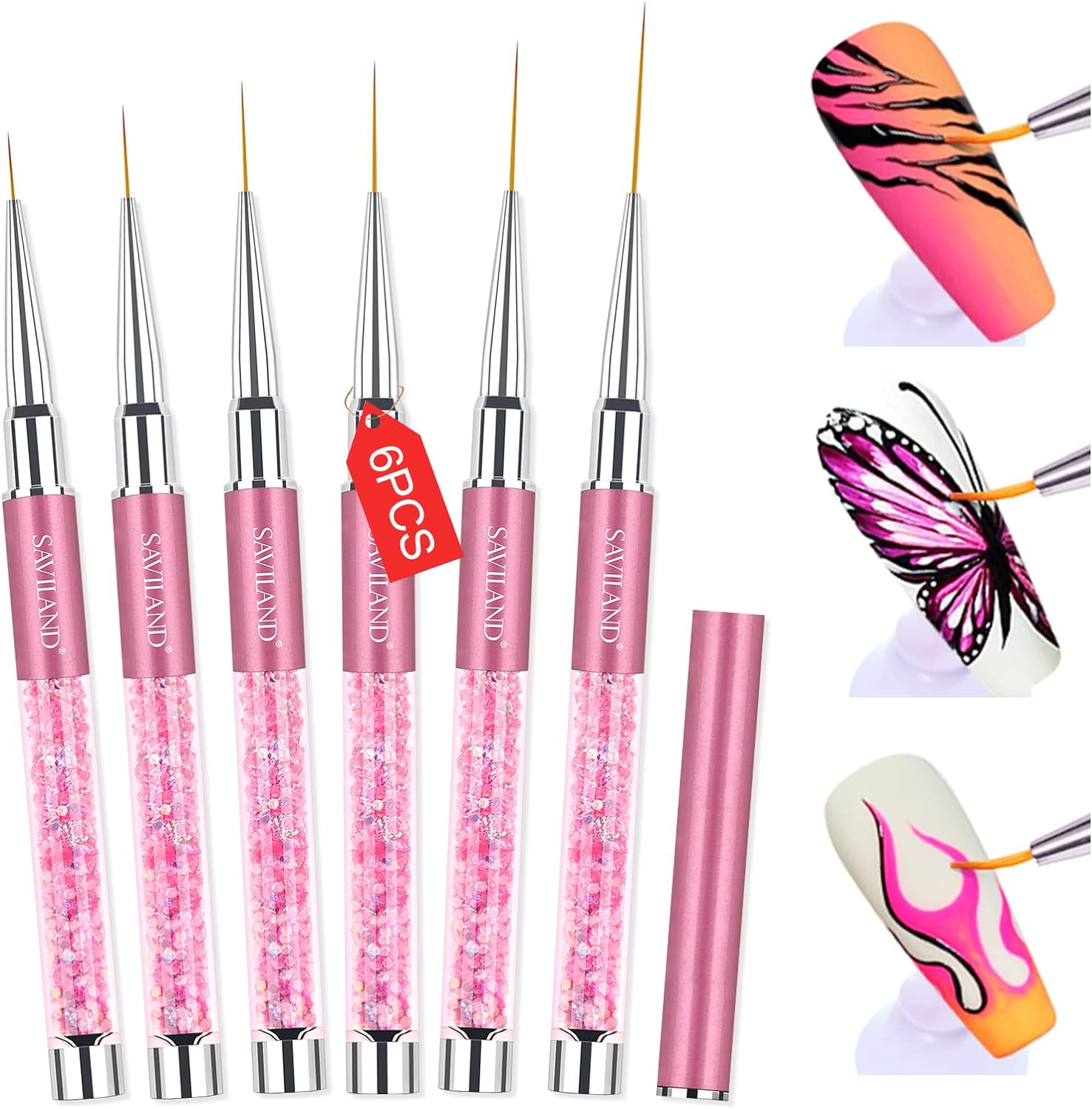 Saviland 6pcs Nail Art Liner Brushes Set - Nail Gel Polish Painting Nail Design Brush Pen Set with Crushed Diamond Rhinestones Handle for Pulling Lines, Nail Art Design, Sizes 7/9/11/13/17/23 mm