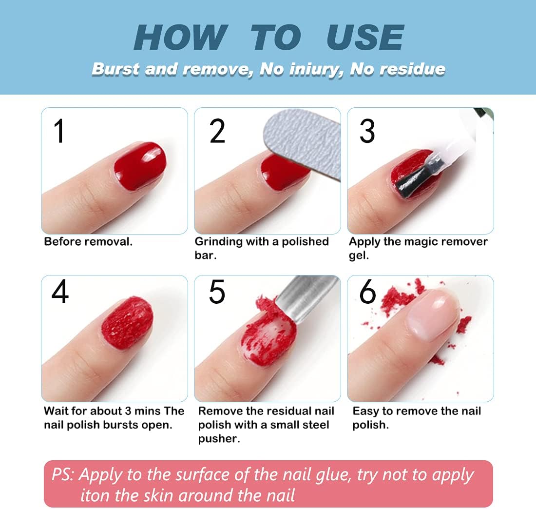 No more aluminum foil wraps or soaking your nails in acetone!Just lightly smear, and wait for 3-5 minutes, the nail surface will automatically burst, and then remove it gently with a small steel pusher. There is no cumbersome removal process and no long waits, saving you time and money.