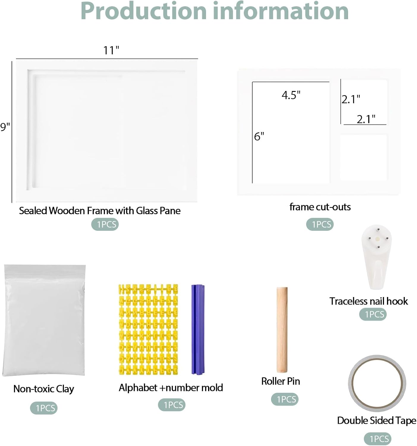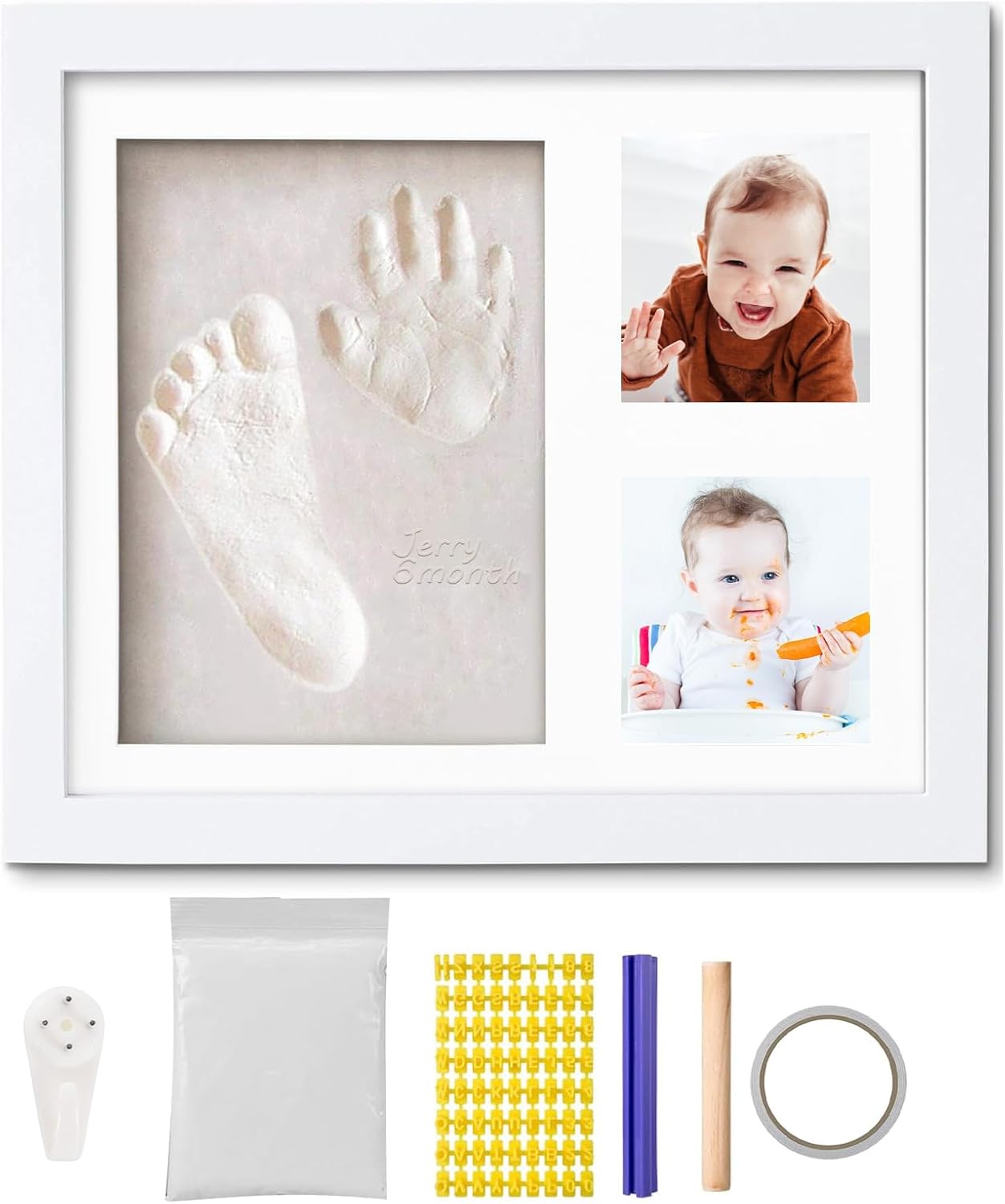 Our baby handprint and footprint makers kit contains everything you need: sealed wooden frame with glass pane, non-toxic clay, double sided tape, rolling pin, alphabet and number mold, trace-less nail hook, cut-out frame.