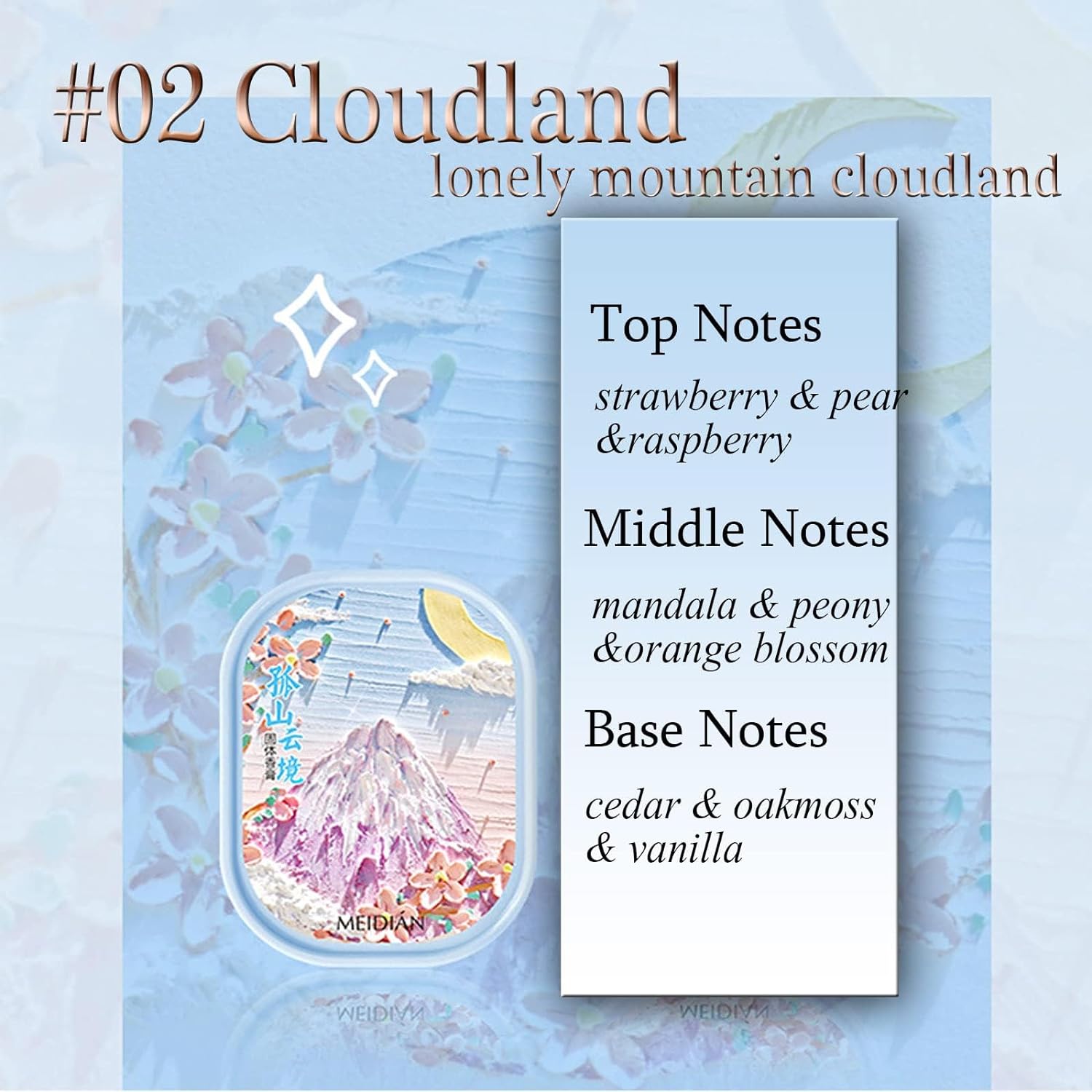 【 Solid Perfume 02# Cloudland 】Cloudland' top notes are strawberry, raspberry, pear, middle notes are mandala, peony, orange blossom, and base notes are cedar, oakmoss, vanilla. It is a solid balm that combines fruity, floral and woody aromas. The overall feeling is passionate and enthusiastic, suitable for girls who are enthusiastic, so that your enthusiasm can be passed on to friends around you. No one can say no to the passionate you.