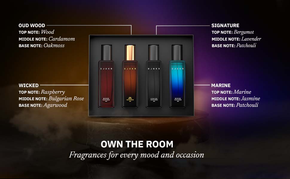 𝐅𝐑𝐀𝐆𝐑𝐀𝐍𝐂𝐄 𝐍𝐎𝐓𝐄𝐒 :- DJOKR Signature :- Bergamot, Lavender, Musk. DJOKR Wicked :- Raspberry, Bulgarian Rose, Amber. DJOKR Oud Wood :- Woody, Vetiver, Oakmoss. DJOKR Marine:- marine, mandarin, and lemon.