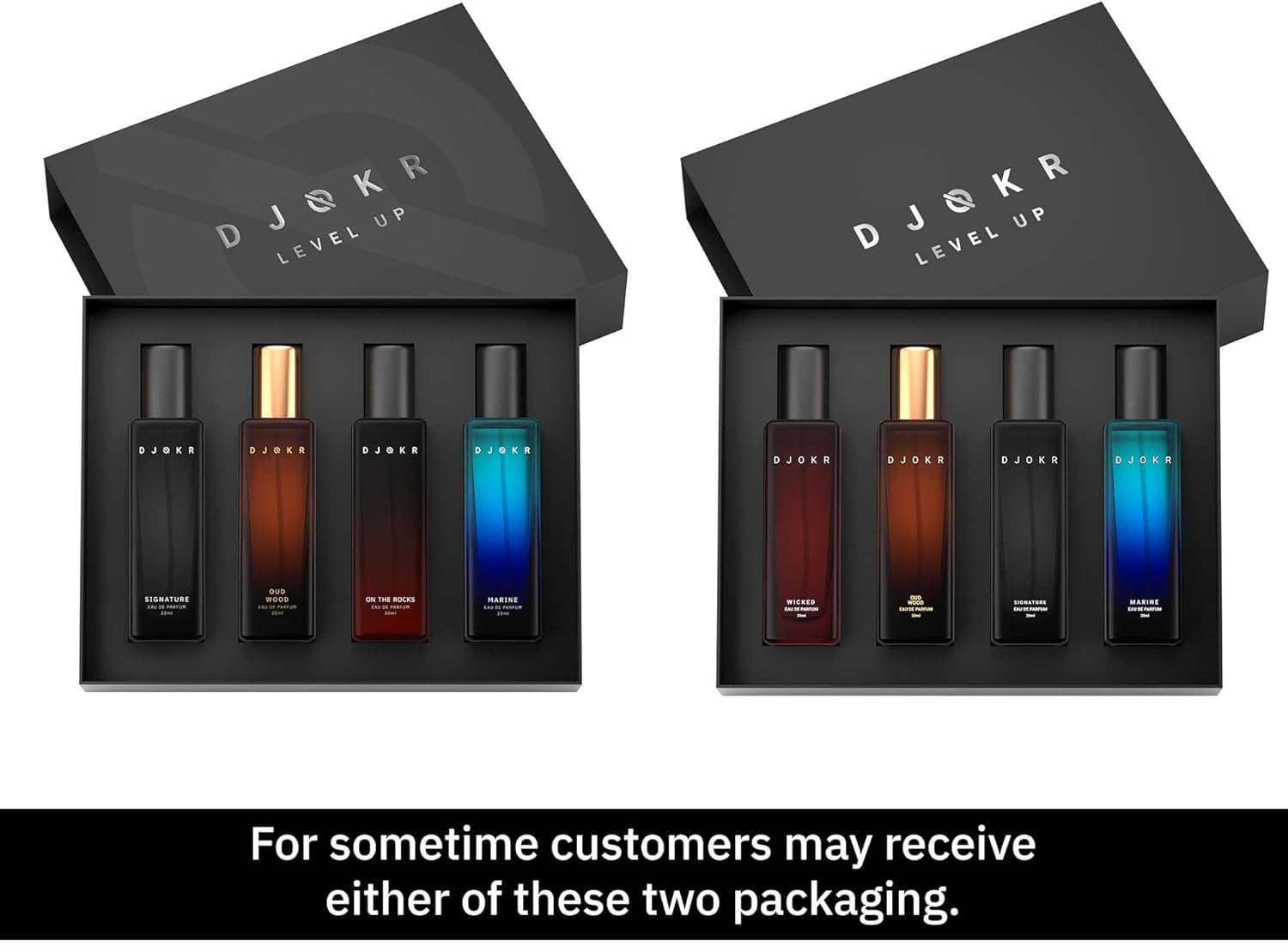 DJOKR Perfume Gift Set for Men Pack of 4x20 ML | Eau De Parfum | Premium Luxury Long Lasting Fragrance Spray | Signature, Wicked, Oud Wood, Marine (4x20 ml)