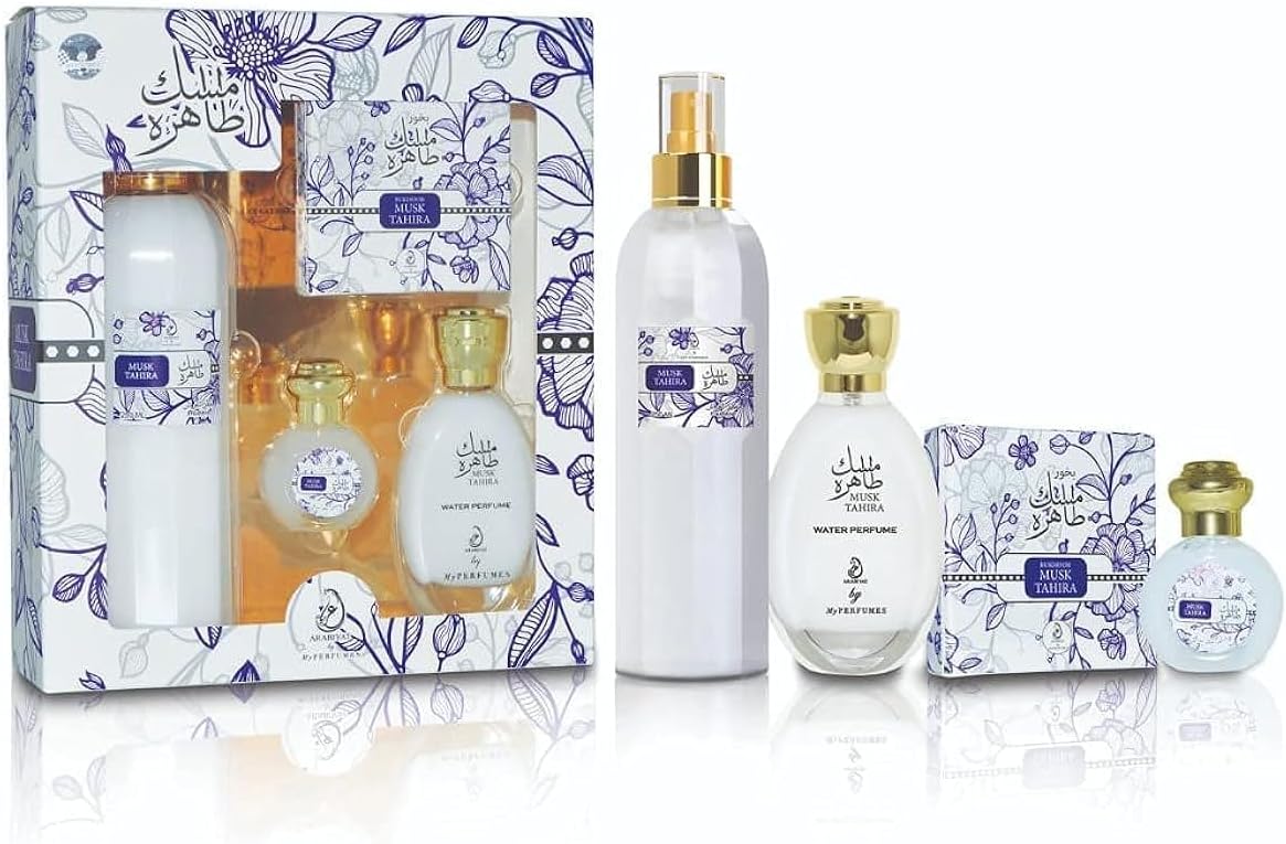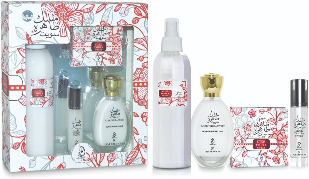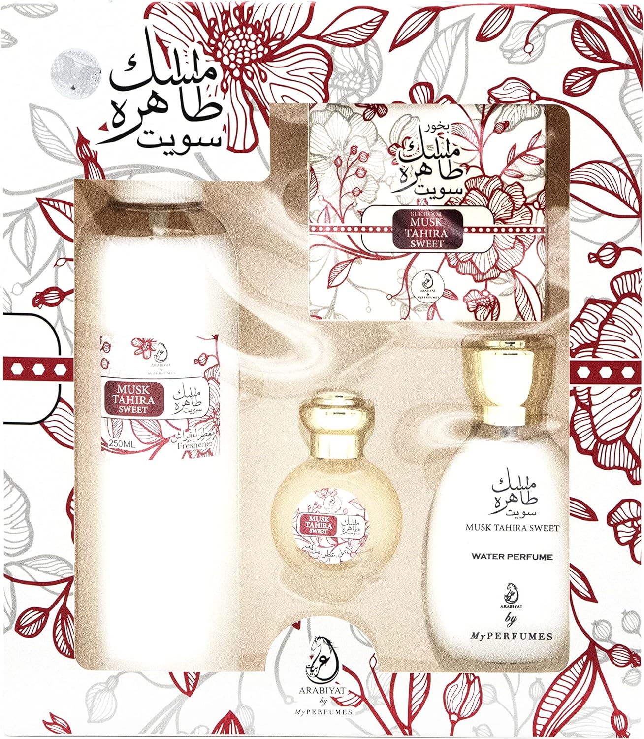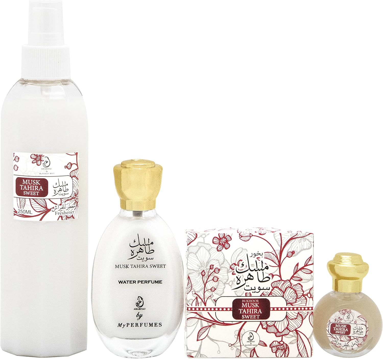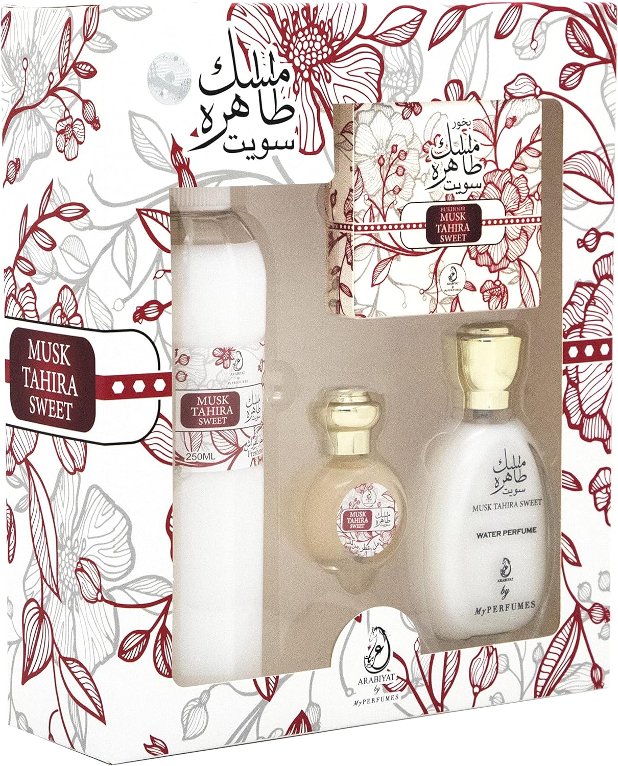 MY PERFUMES MUSK TAHIRA SWEET 4 pieces ARABIYAT Gift Set For Men and Women, Non Alcoholic, 15ml Concentrated Perfume Oil, 40 gm Bukhoor, 35ml Water Perfume, 250ml Air Freshener (MUSK TAHIRA SWEET)