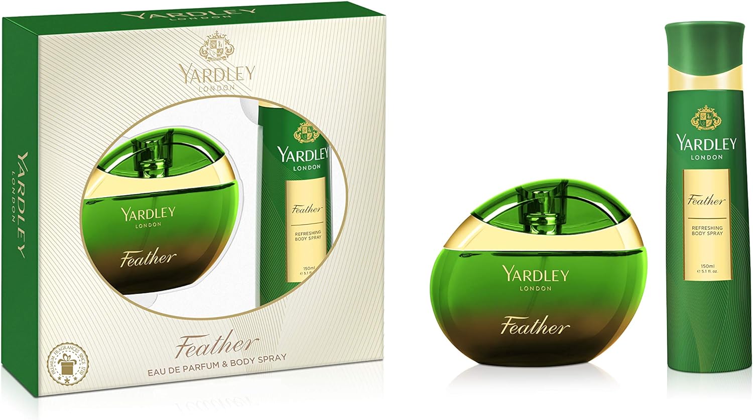 Yardley London Feather Perfume Gift Pack For Sophisticated Women, Lilac, White Lily, Rose And Violet Fragrance EDP Perfume 100 ml + Body Spray 150 ml