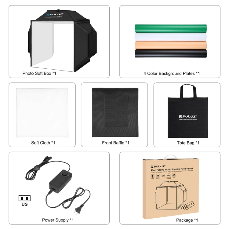 PULUZ 40cm Folding 72W 5500K Studio Shooting Tent Soft Box Photography Lighting Kit with 4 Colors (Black, Orange, White, Green) Backdrops(US Plug)