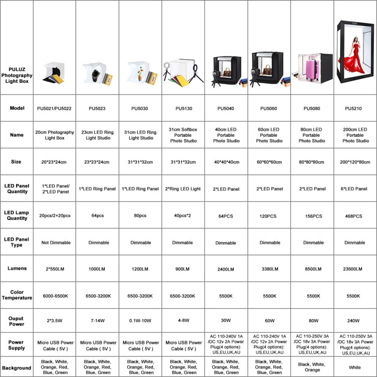 PULUZ Photo Studio Light Box Portable 60 x 60 x 60 cm Light Tent LED 5500K White Light Dimmable Mini 36W Photography Studio Tent Kit with 6 Removable Backdrops (Black Orange White Green Blue Red)(US Plug)