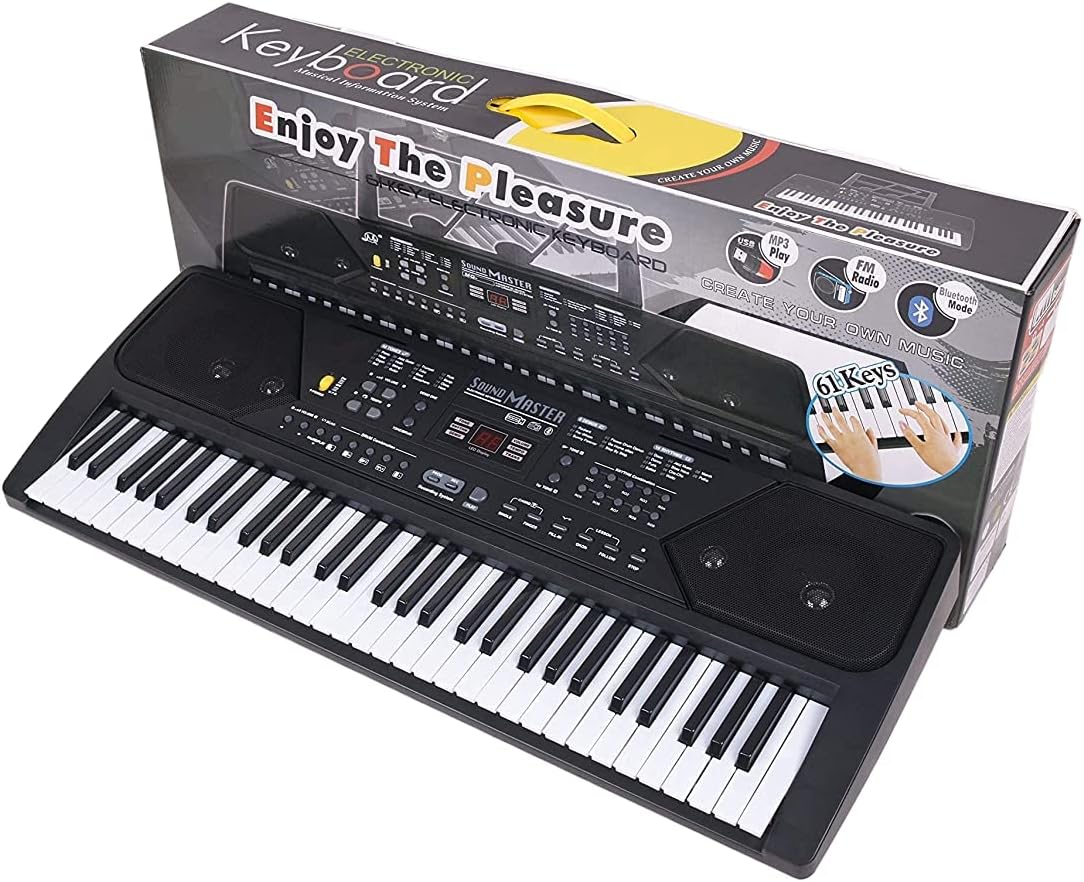 61 Keys Piano Keyboard Electrical Musical with LED Display, Microphone, Adjustable Volume, Notes Stand, 16 tones, 10 rhythms, 5 percussions, Bluetooth, Radio, MP3 Player, DC Power Cable & More