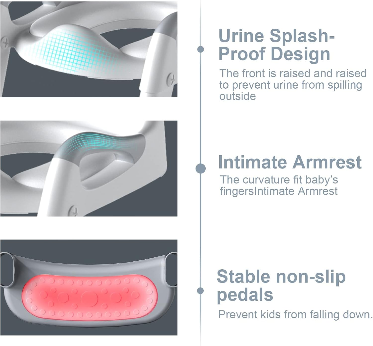 🚽STABLE AND ERGONOMIC DESIGN: Our potty training toilet has an embracing backrest design to protect your baby's spine. Anti-splash urine design prevents baby from urinating.