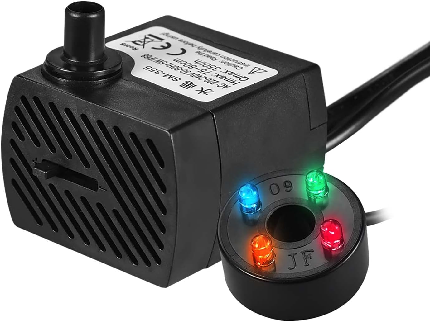 Eacam 350L/H 5W Submersible Water Pump with 4 LED Light Ultra Quiet for Pond Aquarium Fish Tank Tabletop Fountain Hydroponics 4.9ft (1.5m) Power Cord- Black