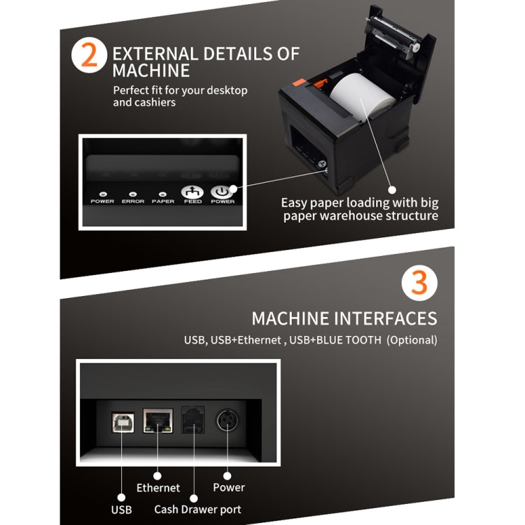 2. High printing quality, low cost, low noise, high speed printing, support cash drawer driver language: support multiple languages