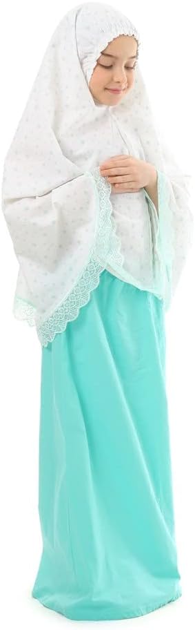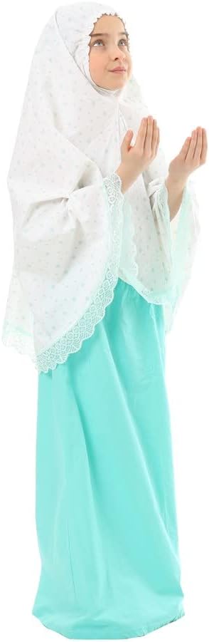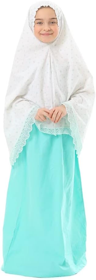 ELANESA Girls prayer clothes kids Islamic clothing 2 piece set prayer clothes skirt dress with a head scarf and A rosary gift