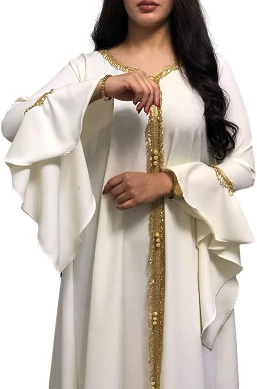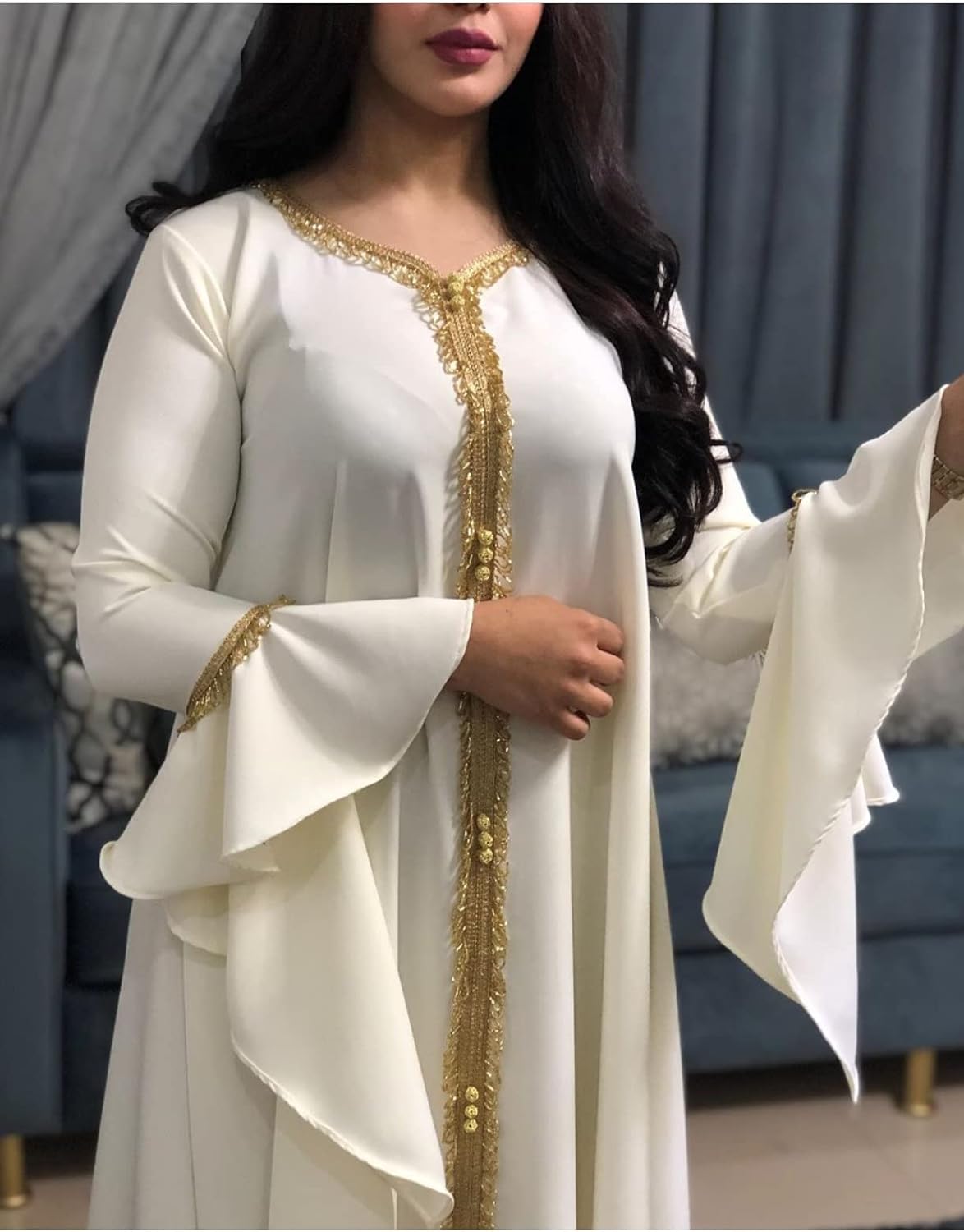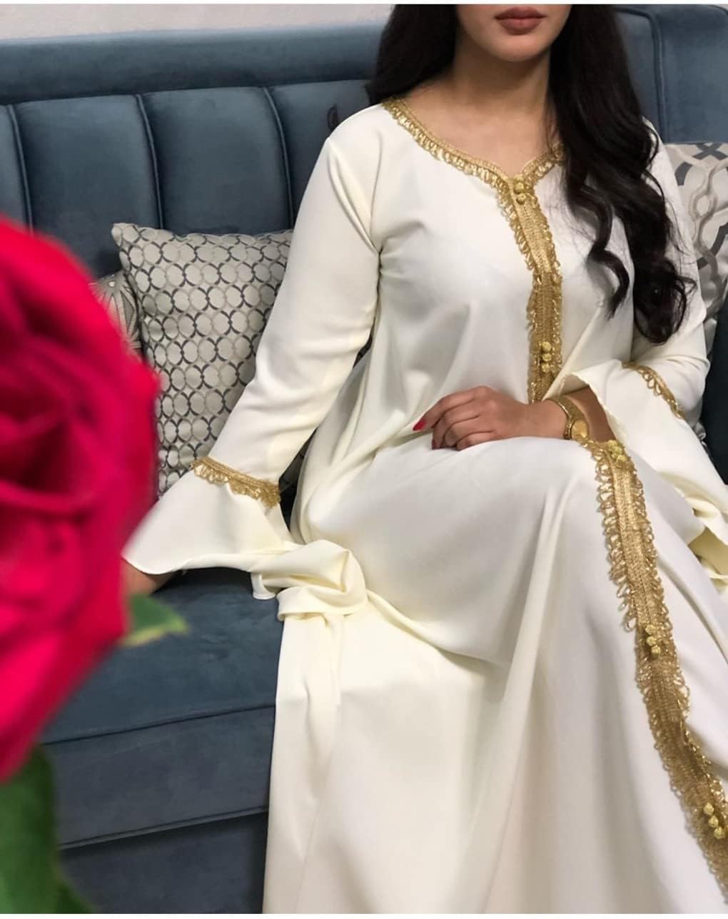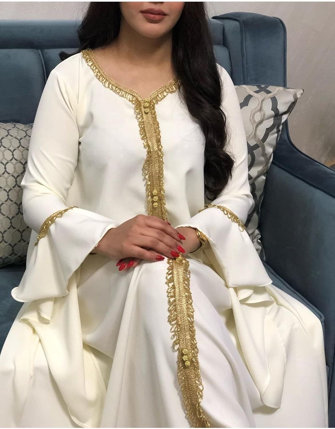 Jalabiya Kaftan Dress For Women Dubai Turkey Golden Ribbon Embroidery Loose Muslim Arabic Islamic Clothing White 2020
