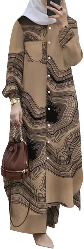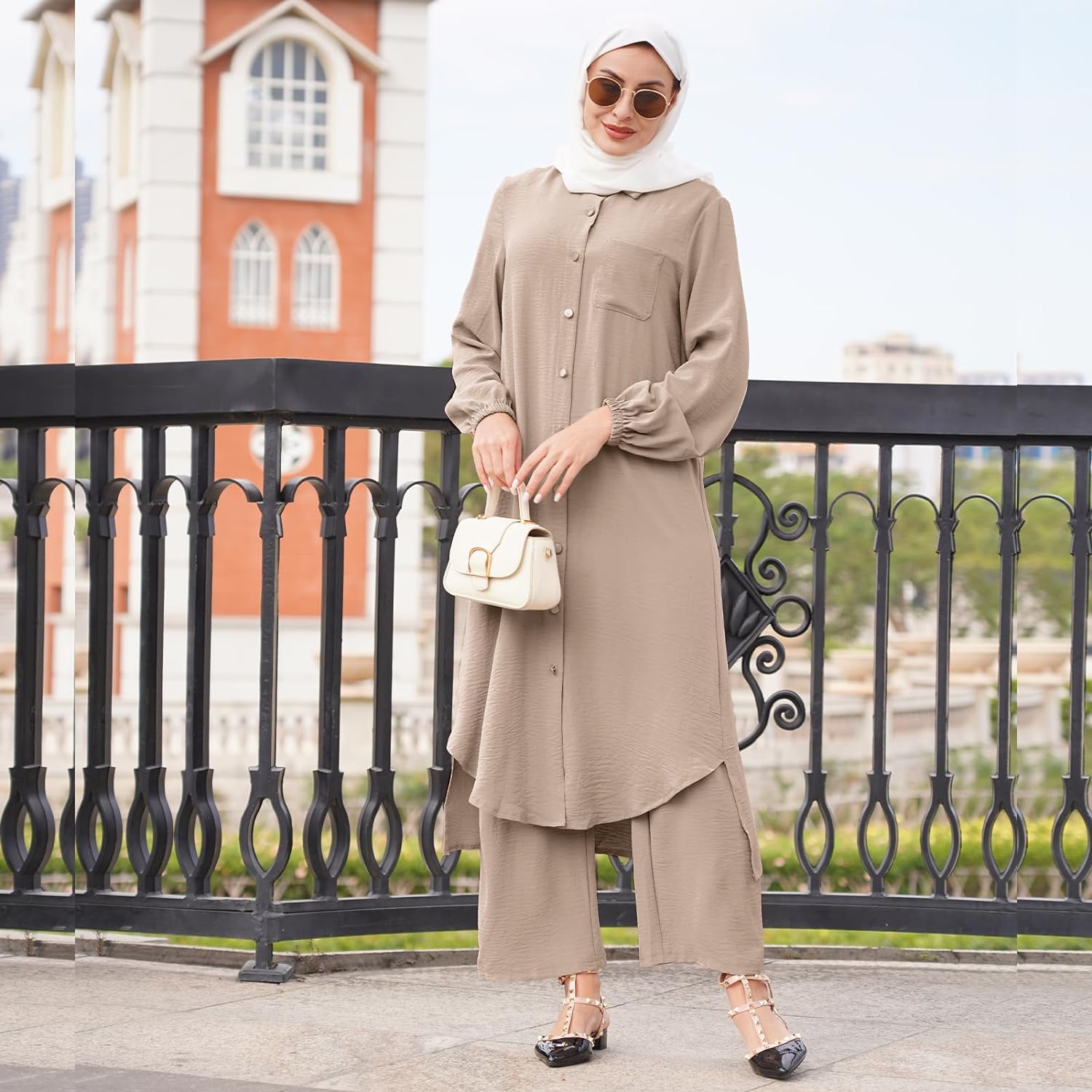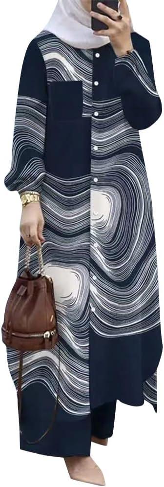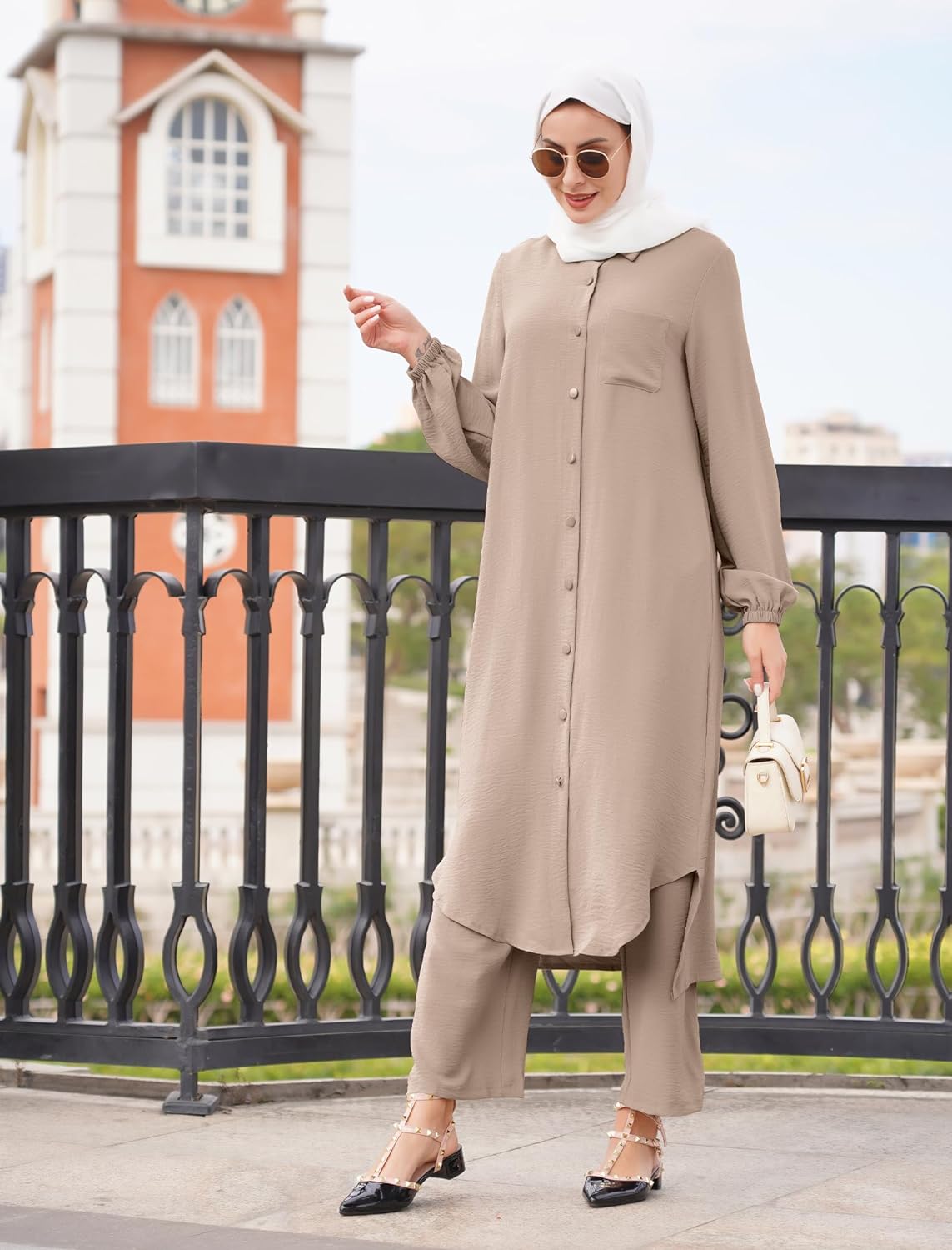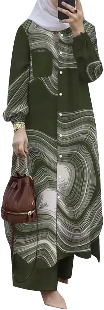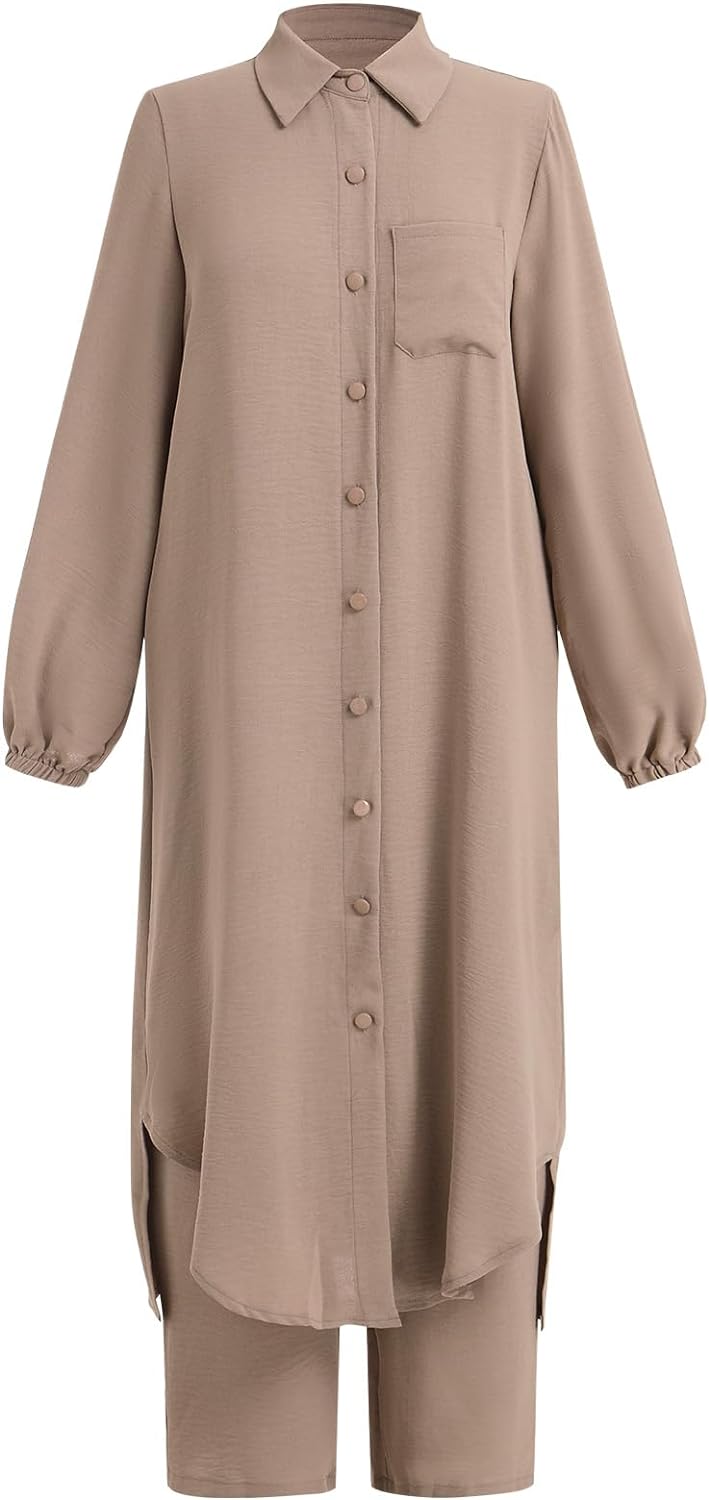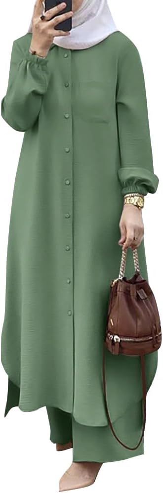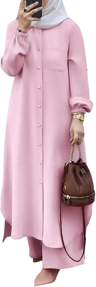 - ❤ ❤ Package Include: 1PC Shirt + 1PC Pants; Women's Muslim 2 Pieces Sets Long Sleeve Button Down Shirt and Pants Abaya Casual Dubai Outfits. Features: Long Sleeve, Turn-down Collar, Elastic Cuffs, Chest Pockets, Button Closure, Elastic Waistband, Loose Fit. The baggy material can ensure the best comfort after hours of studying or working.
