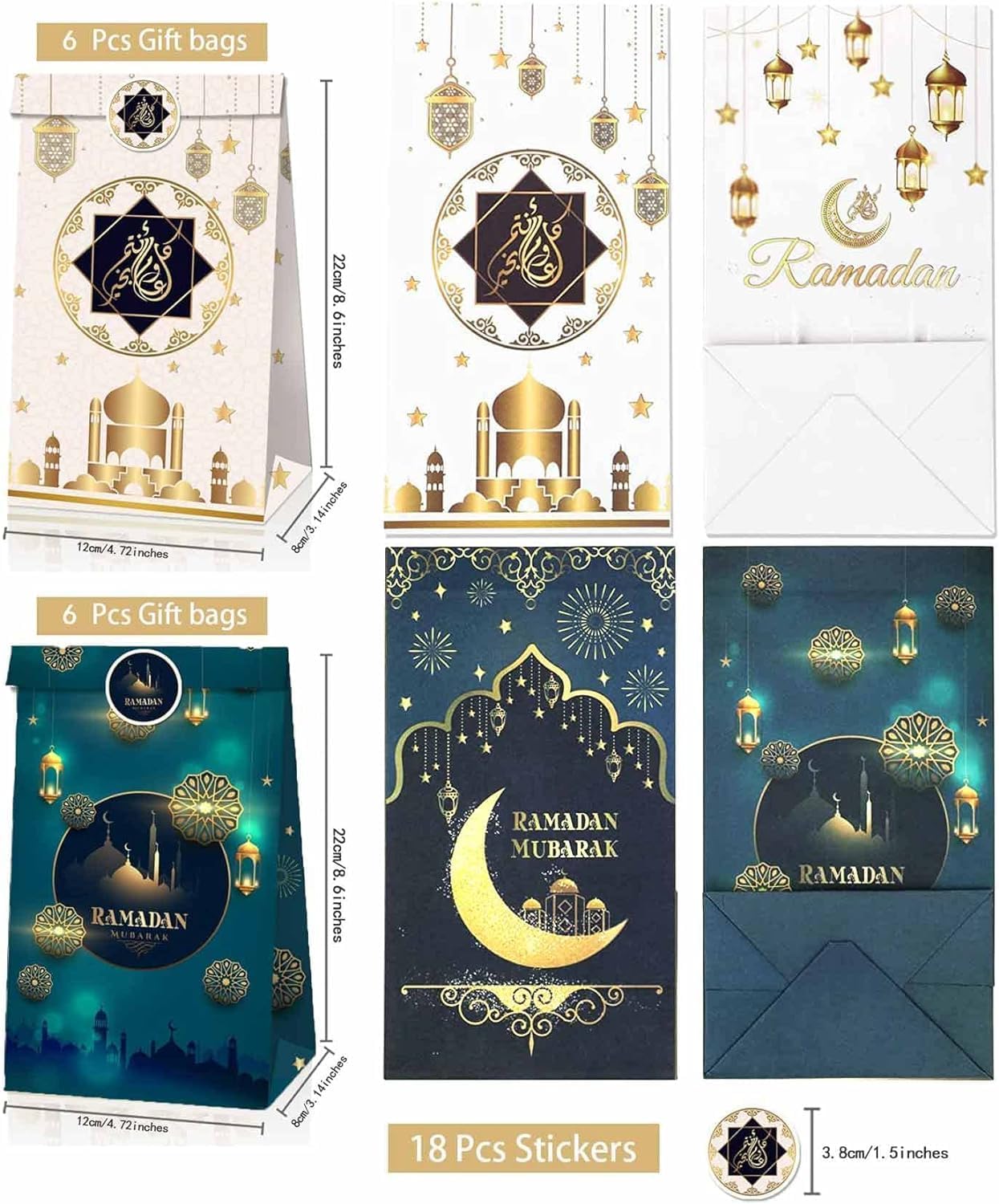 What will you receive: the package contents 2 different styles of gift bags, a total of 12, 6 of each style, the front and back of each bag have different patterns. We also provide you with 4 different styles of Ramadan stickers, a total of 18, which can be applied to seal these Eid Mubarak party treat bags