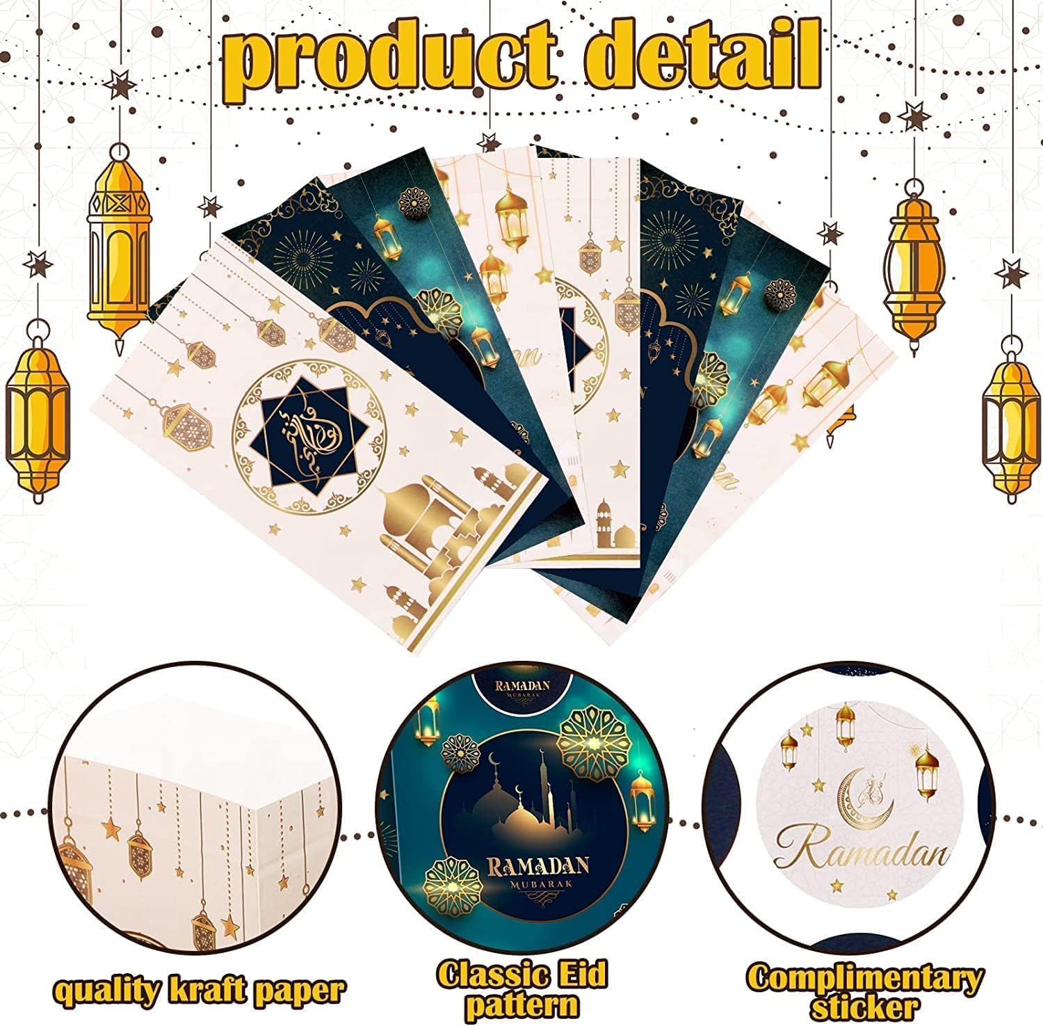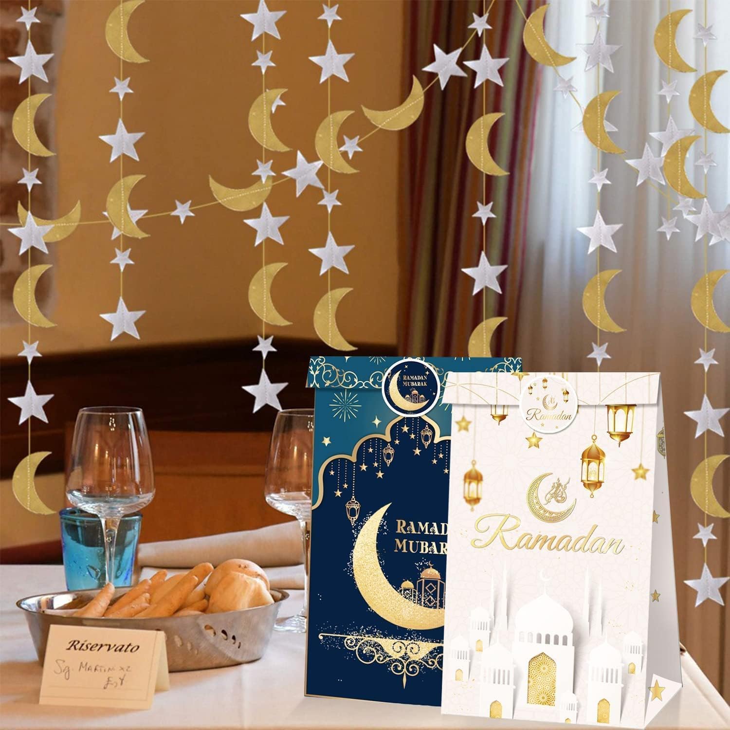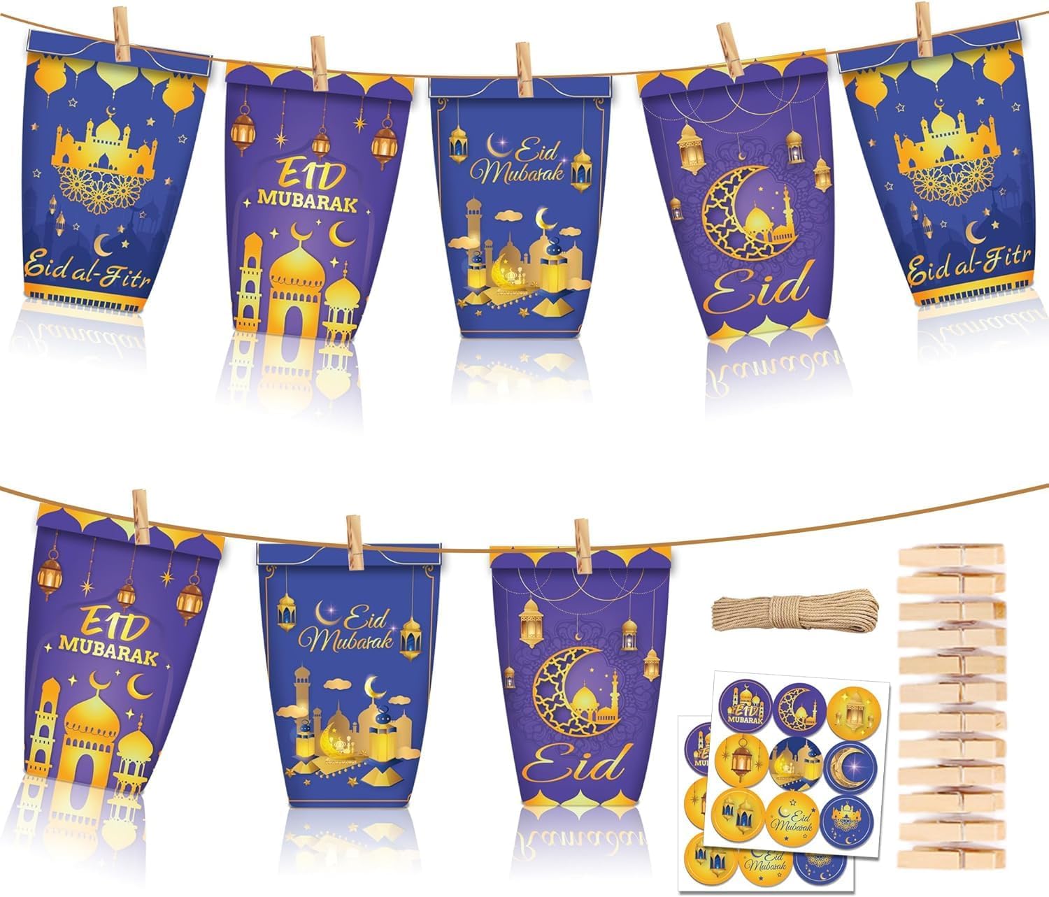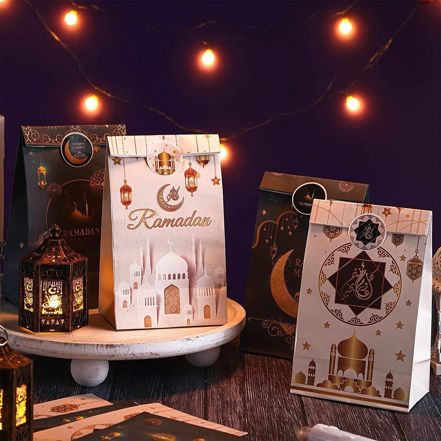 Featured Design: The Eid Mubarak gift bags and stickers are printed with stars, moon, Ramadan lanterns, mosque, and fireworks, they look like they're glowing, pretty and complement to the Eid theme party, which will make your Ramadan party more impressive and unforgettable