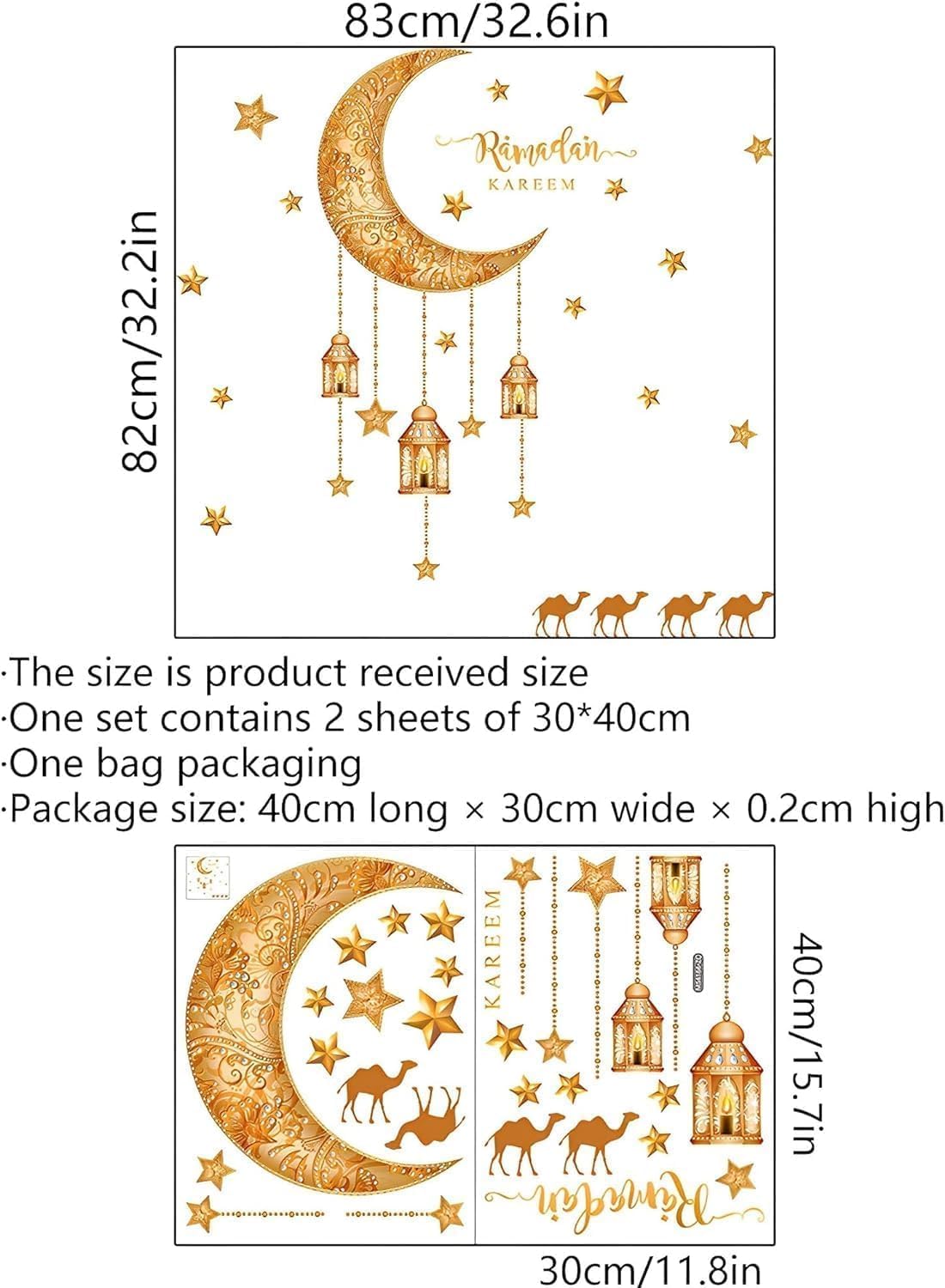 Package content - 2 Sheets 30*40 cm wall stickers. Included crescent moon, star and lantern etc.