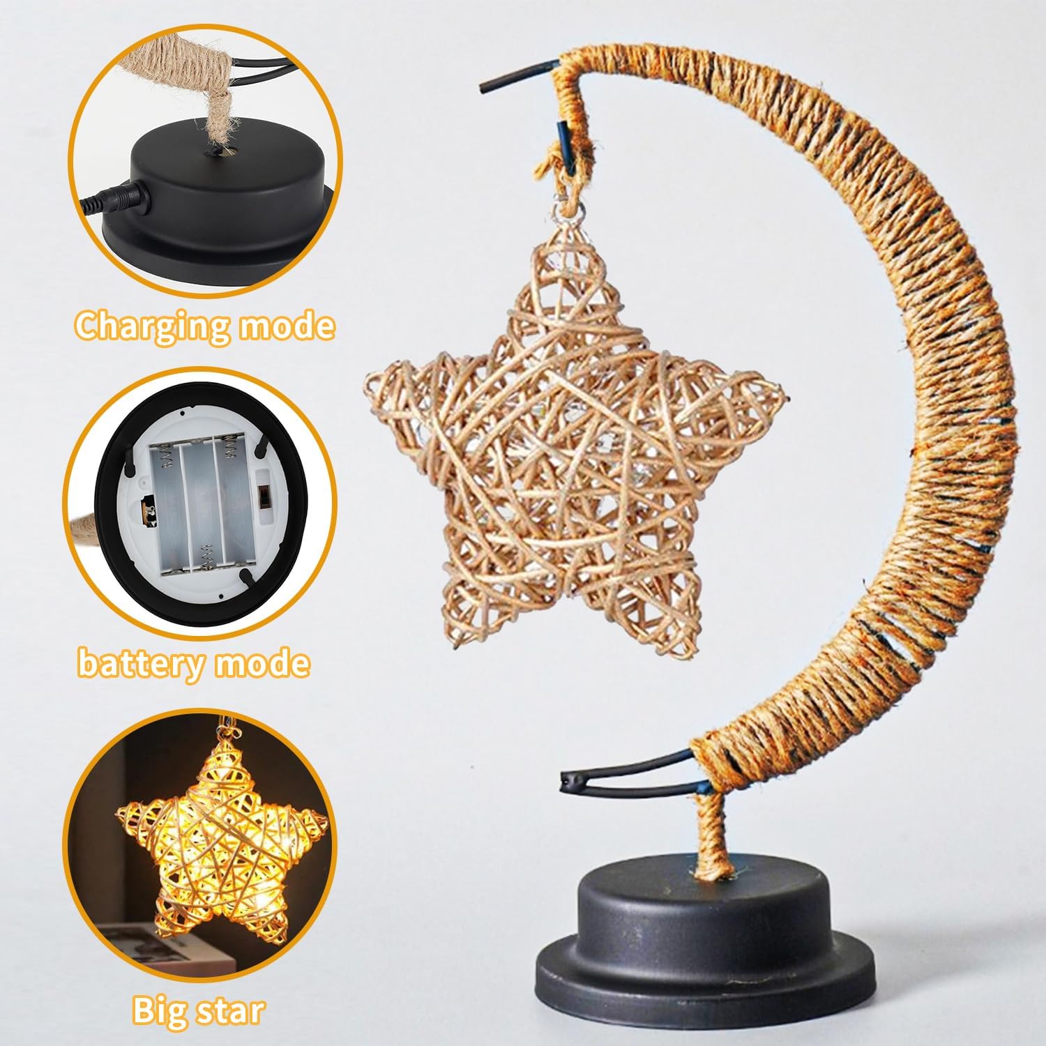 【Moon Shape Design】--- The Ramadan decorations for home is designed with a crescent shape lamp holder, star shaped rattan is hung on the black iron moon holder winded by hemp rope. Star light eradiating warm light, does not hurt eyes.