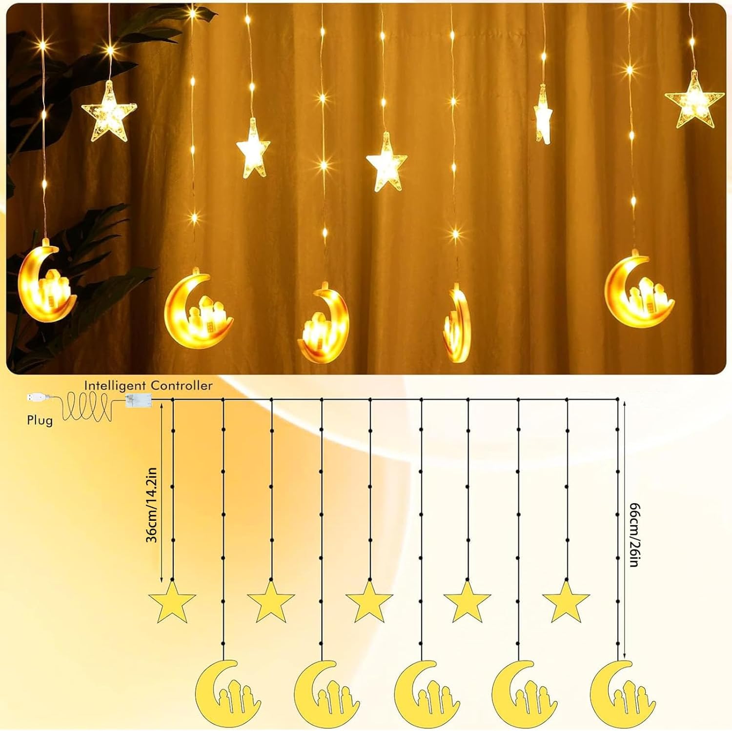 【Ramadan Decorations】You will receive 1 piece of Ramadan light, with 10 strings of moon and stars lights, 115 LED, attractive and practical, suitable for you to adorn windows, railings, curtains, fences or other places.