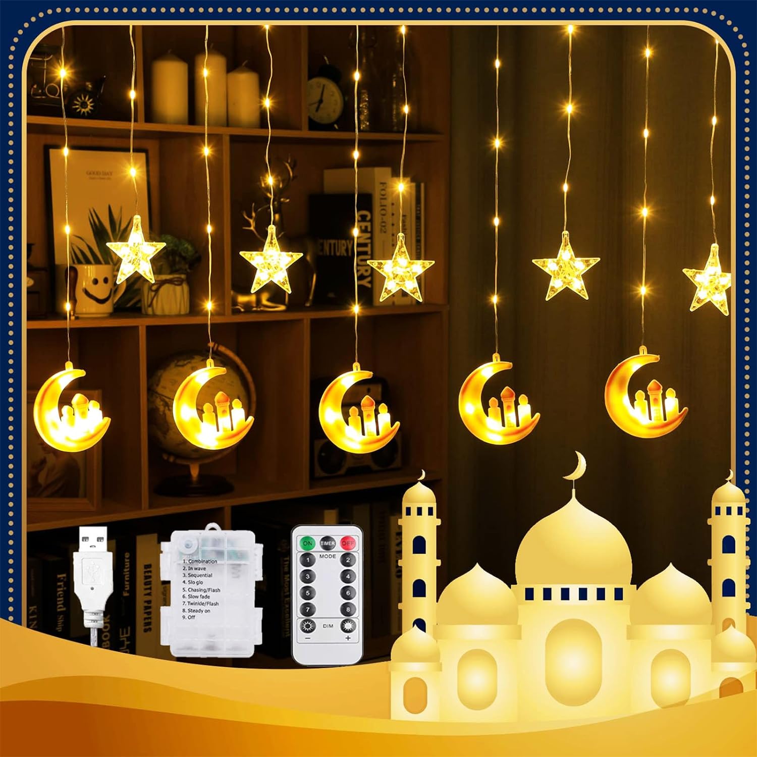 Tiokkss Ramadan Lights Decorations Star Moon Castle Curtain Lights Battery & USB Powered Eid Mubarak Lights with Remote Control 8 Lighting Modes Ramadan Decorations for Home