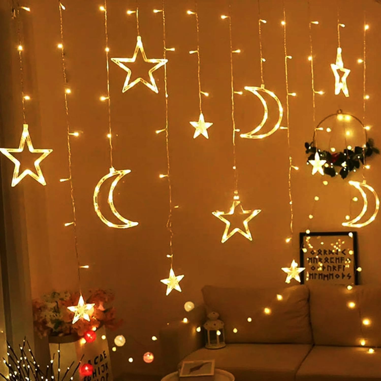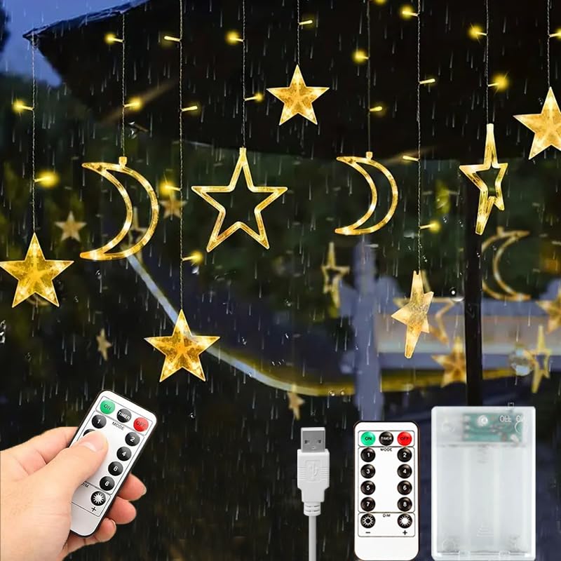 【Ramadan Star Moon Lights】- The star moon curtain lights with 12 drops of star and moon-shaped bulbs that make an adorable addition to your porch or outdoor living space. ( 9 star lights and 3 moon lights )