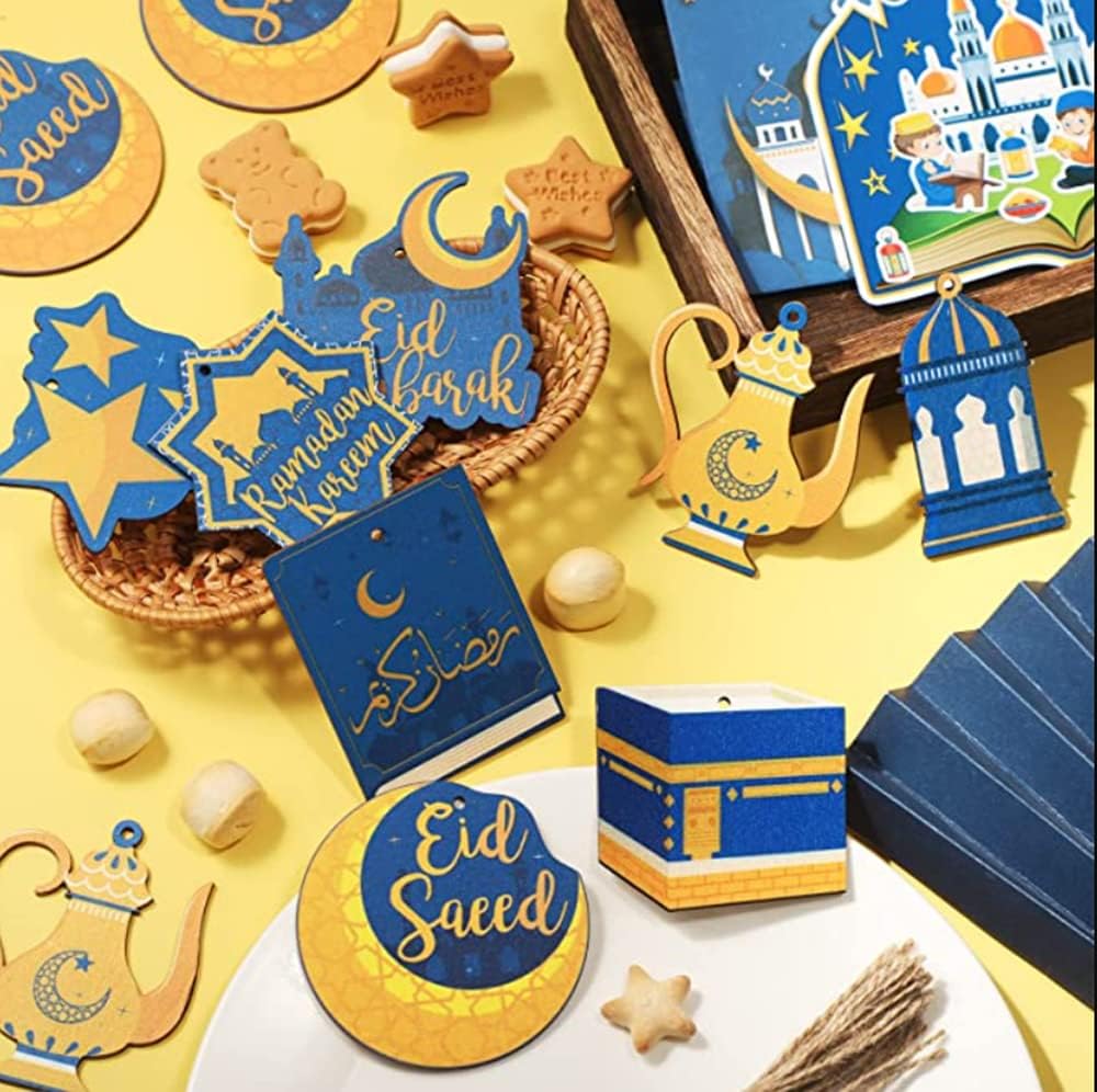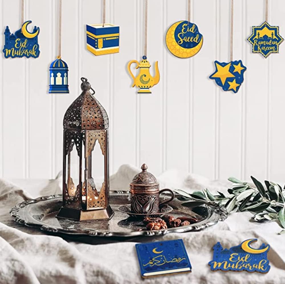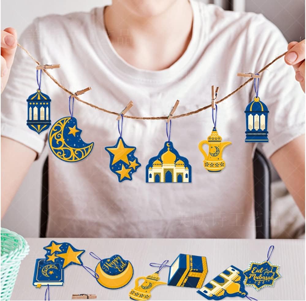 【Delicate Design】: the happy Eid Mubarak hanging decorations are designed with Ramadan Mubarak elements like star, wind lamp, pray book, moon, teapot, mosque; Really help to raise the party atmosphere thanks to their bright colors and festive elements