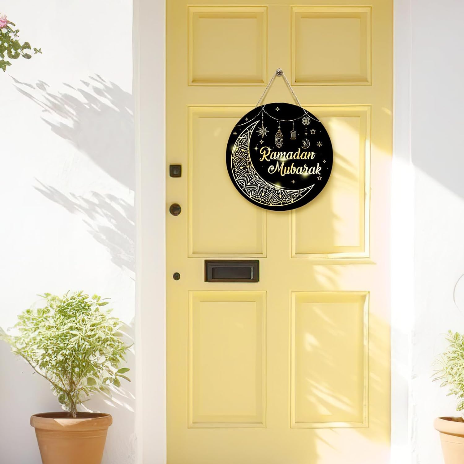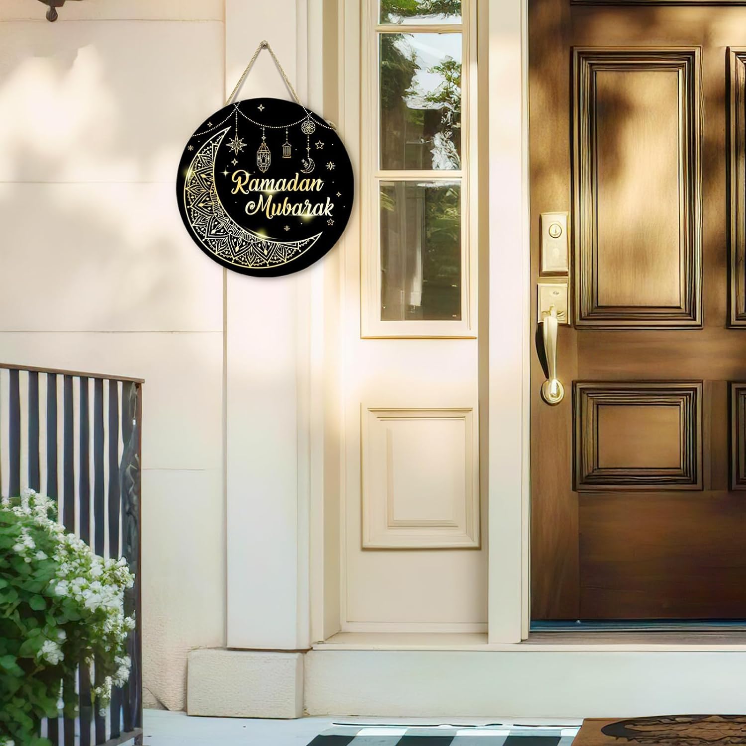 đEasy to Use: The Ramadan mubarak wooden door sign comes with its own hole above, the twine can be hung anywhere by passing it directly through the hole. Decorate your fireplace, entrance hall, room door, living room and Eid mubarak party etc.