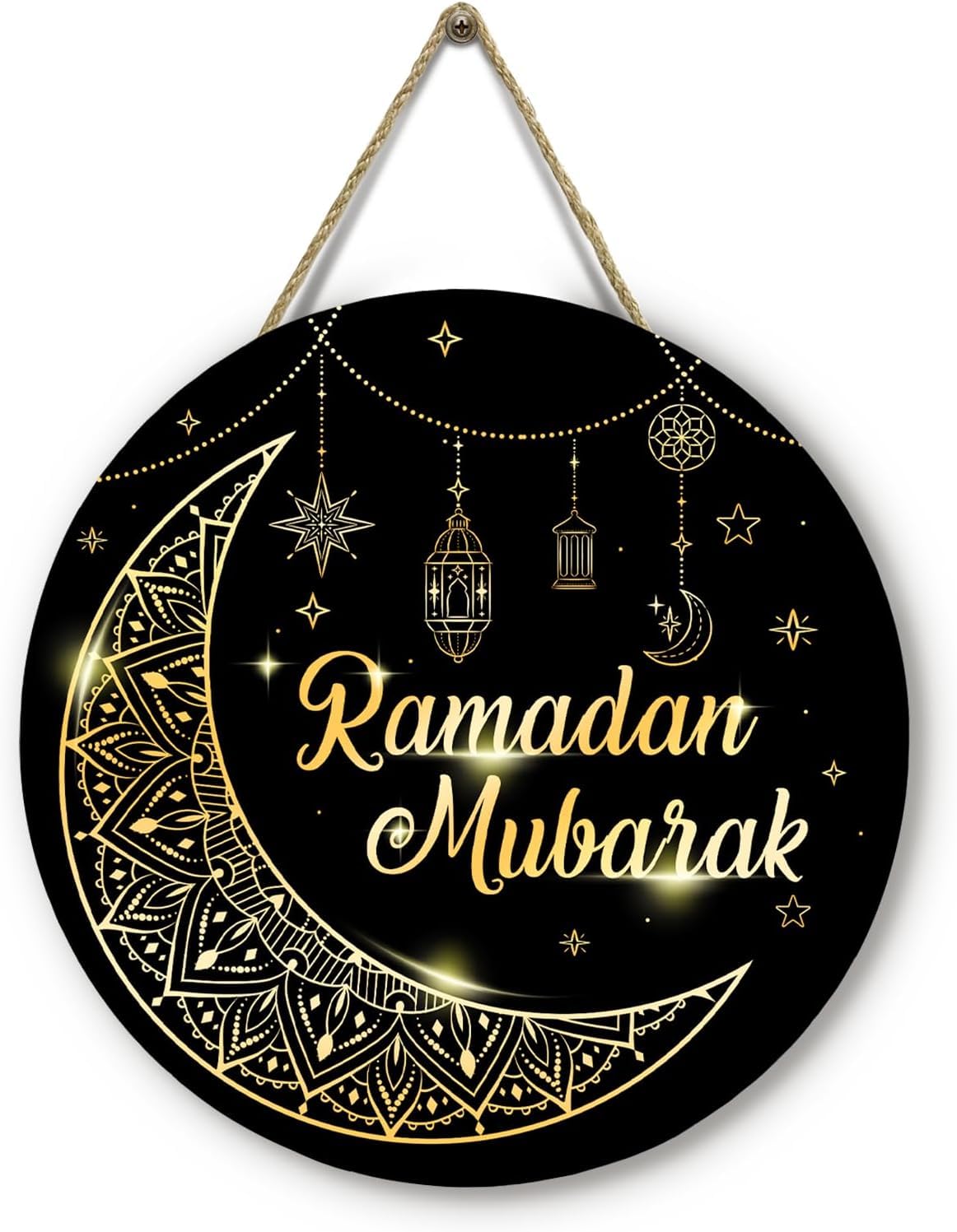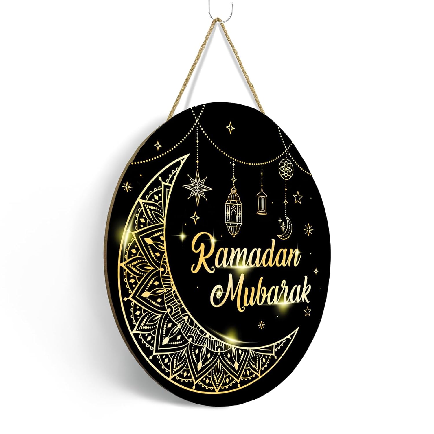 đClassic Design: This Ramadan mubarak door sign features the words Ramadan Mubarak with a more authentic element of the moon, stars and lantern; these decorations will embellish any space and create an atmosphere of celebration during this holy festival.